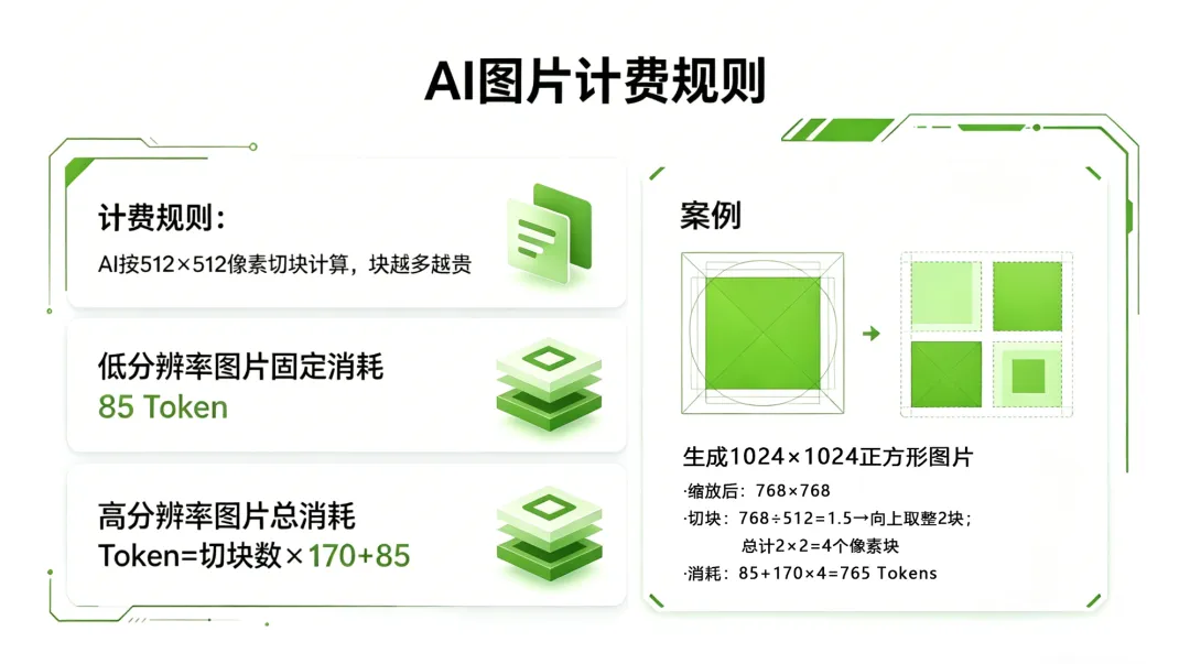 1024×1024 → 缩放后768×768,切块4个 → 消耗约765Tokens