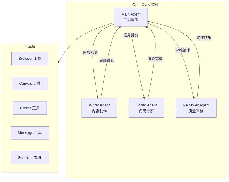 OpenClaw 采用分布式多 Agent 架构,将复杂任务拆分为多个专业角色协同完成: