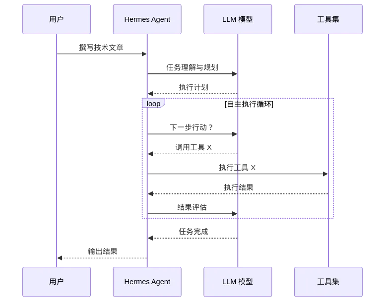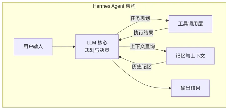 Hermes Agent 采用集中式单一 Agent 架构,依靠强大的 LLM 进行自主规划和工具调用: