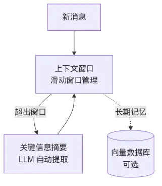 | 上下文管理 | 滑动窗口 + 关键信息提取 | 实现简单 |