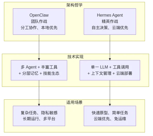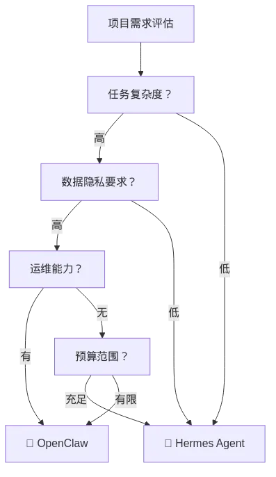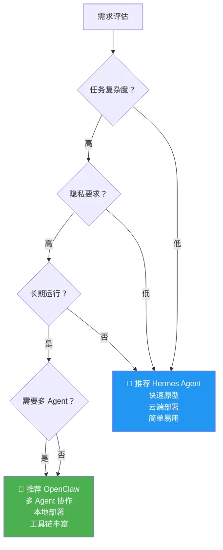 快速原型、简单任务、云端部署 → 选择 Hermes Agent