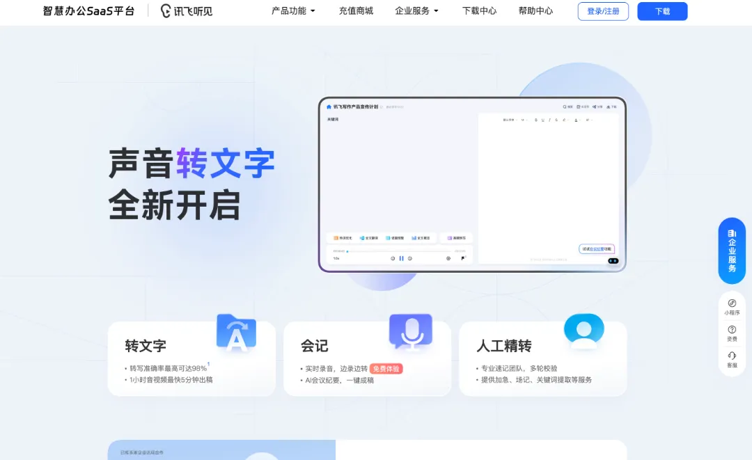 官网改编介绍:讯飞听见是科大讯飞推出的智能语音转写与翻译平台,依托核心语音识别与星火大模型技术,提供实时录音转文字、音视频文件转写、多语种翻译及AI会议纪要生成等服务,支持多端使用,准确率高,可提取会议行动项,覆盖近9000万用户。