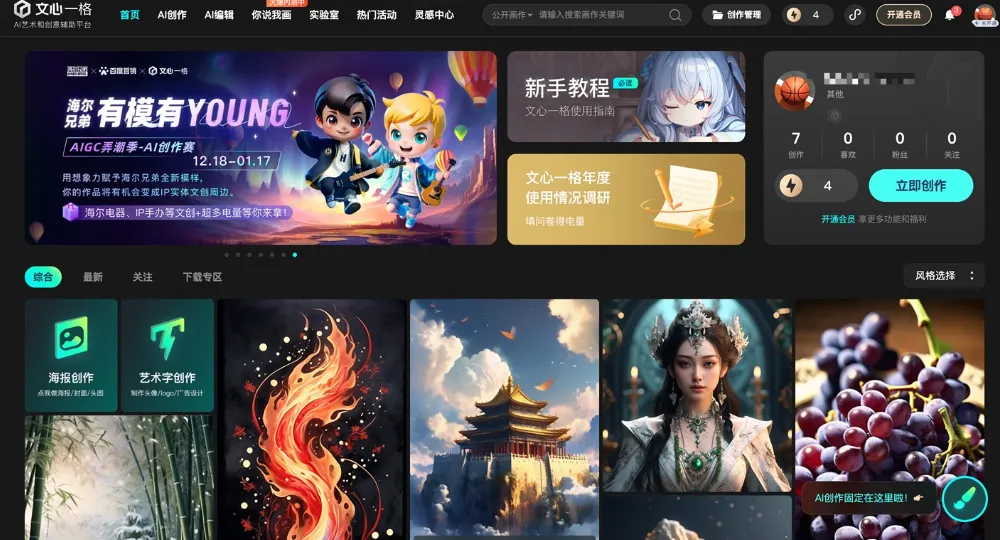 官网改编介绍:文心一格是基于人工智能技术的AI绘画产品,通过深度学习技术,可根据用户中文提示词快速生成具有高度艺术感的插画、海报、Logo、创意图片,支持自定义风格、尺寸、色调,提供丰富素材图库,社区可分享免费提示词,对新手友好。