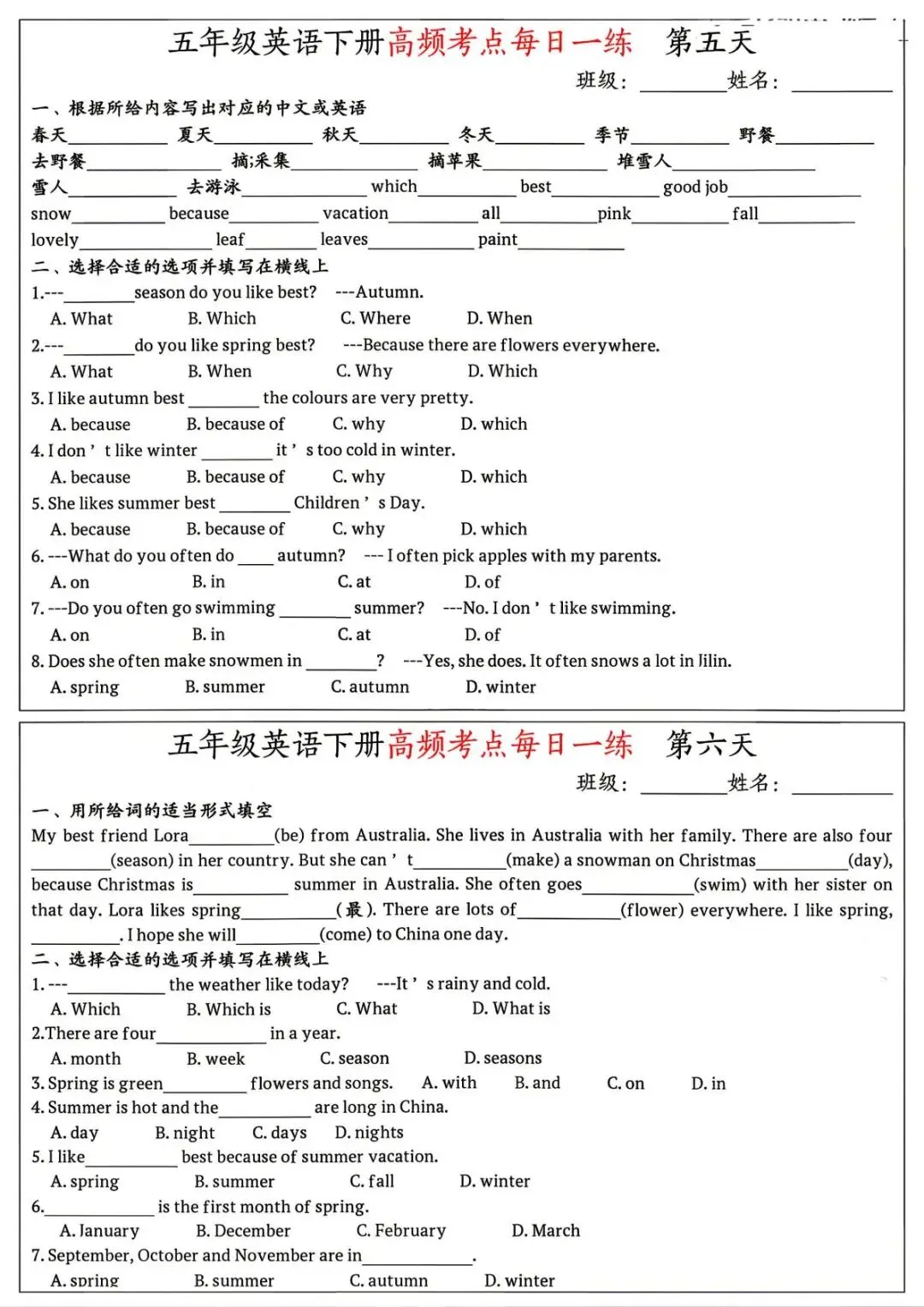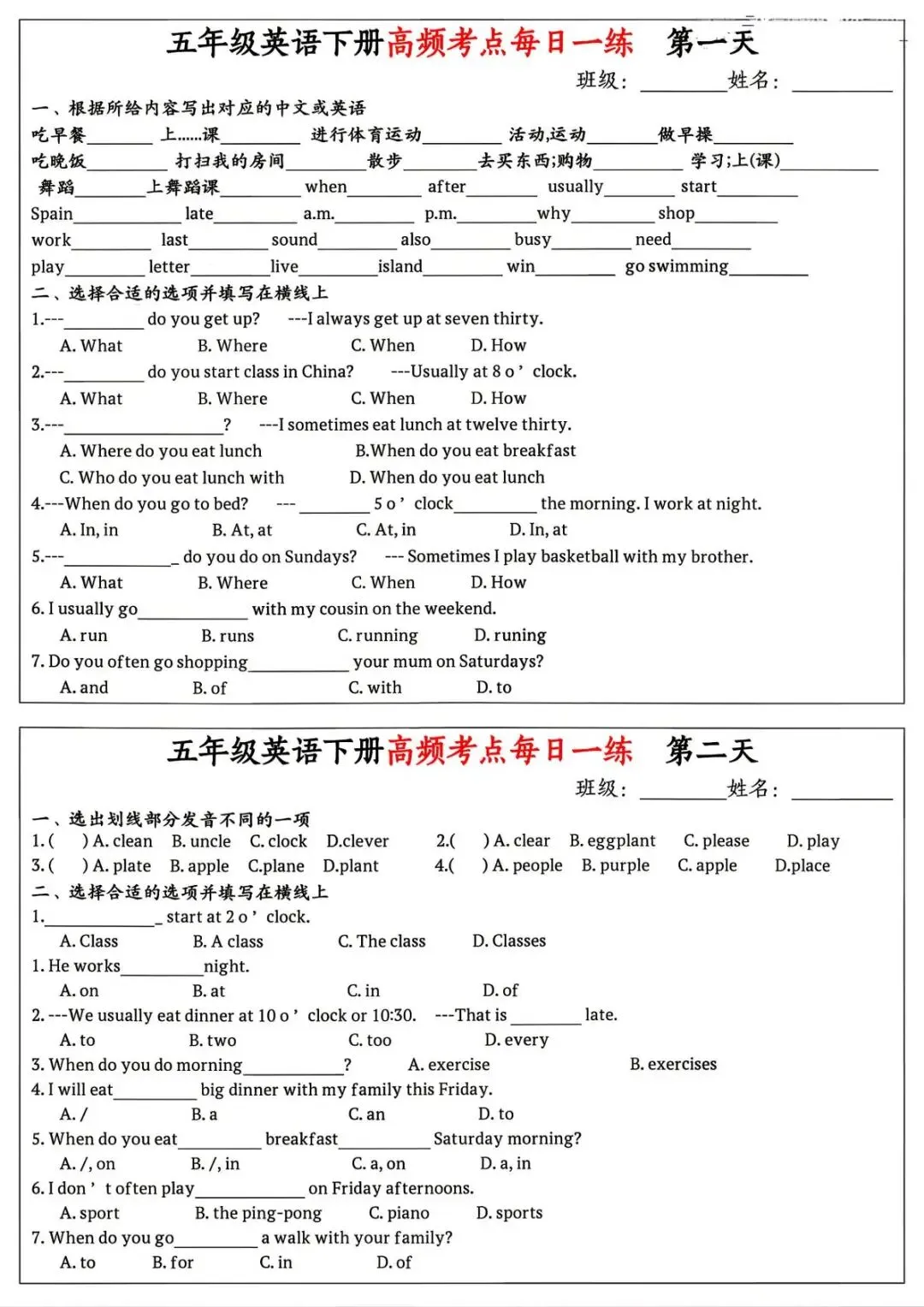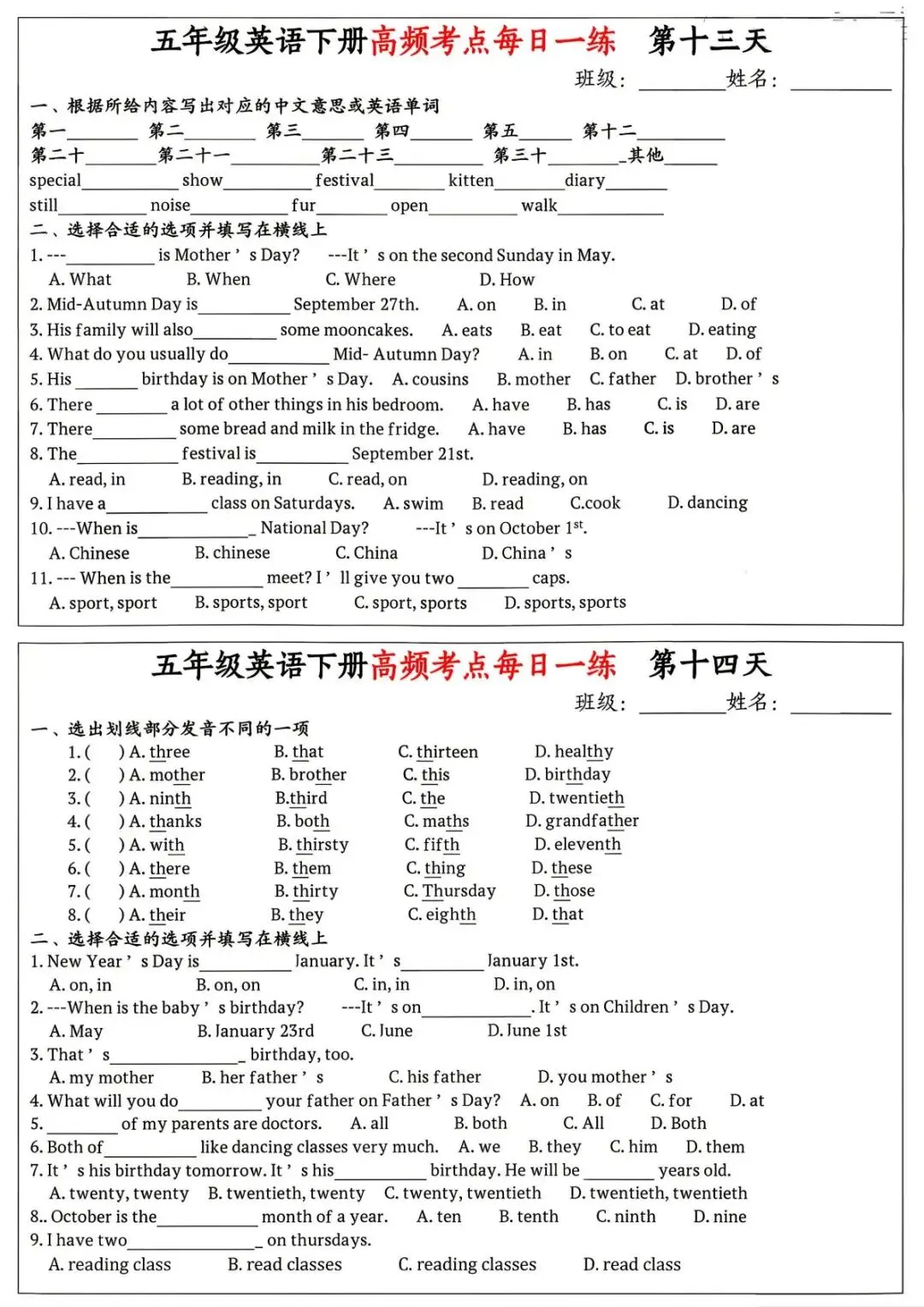 26春五年级下册英语期中复习14天冲刺-电子版可打印