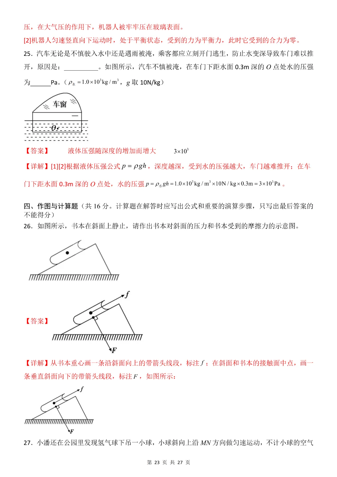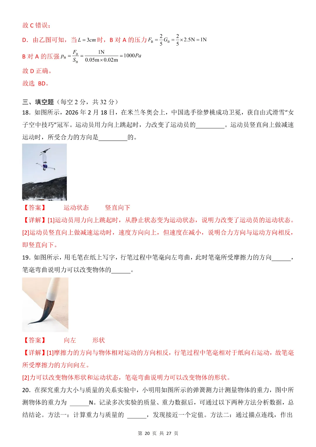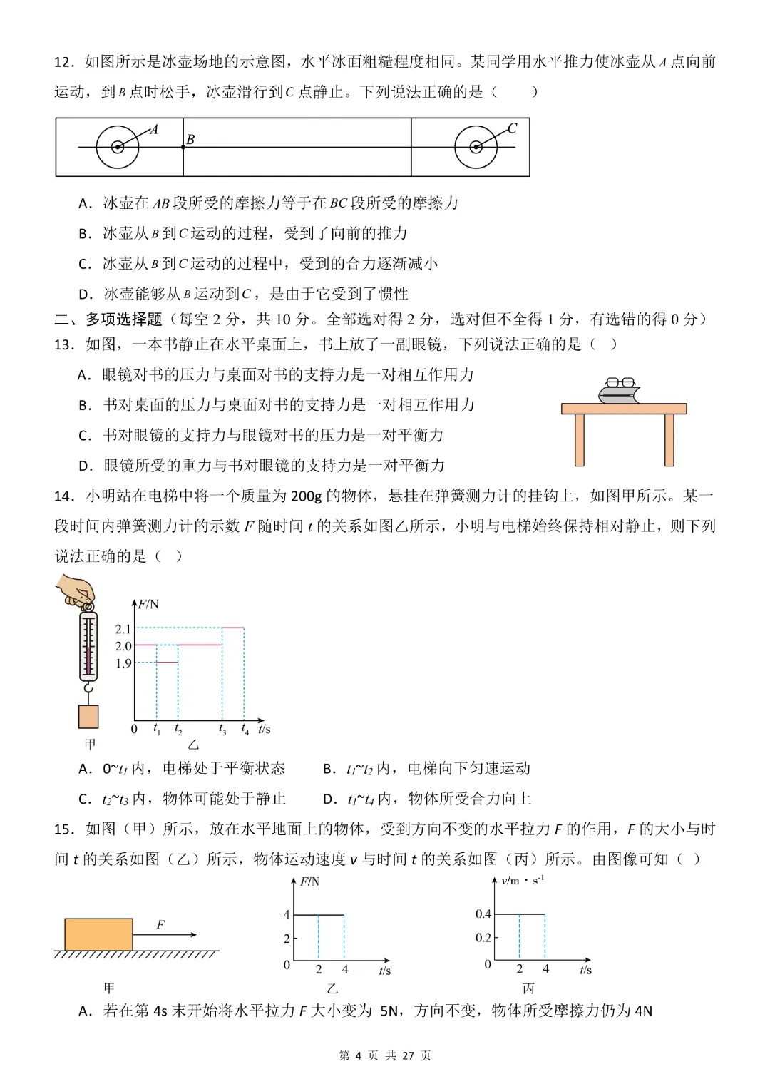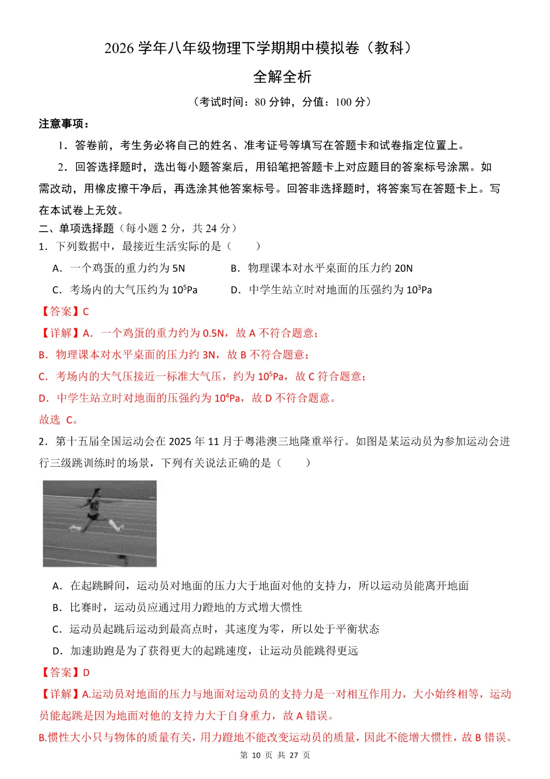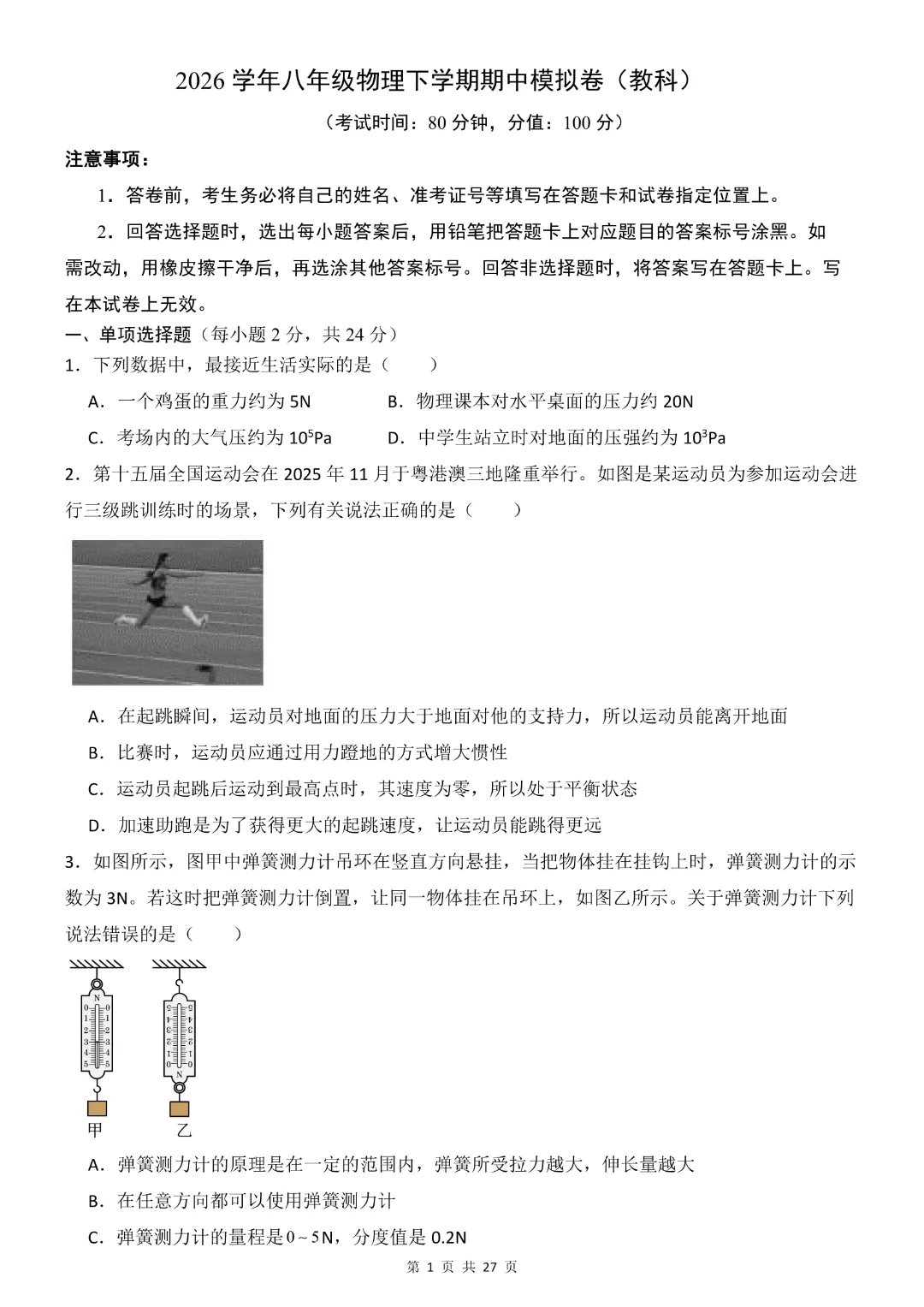 26年八年级下册物理·期中模拟卷(教科版)完整高清电子版可打印