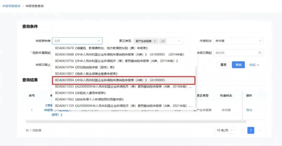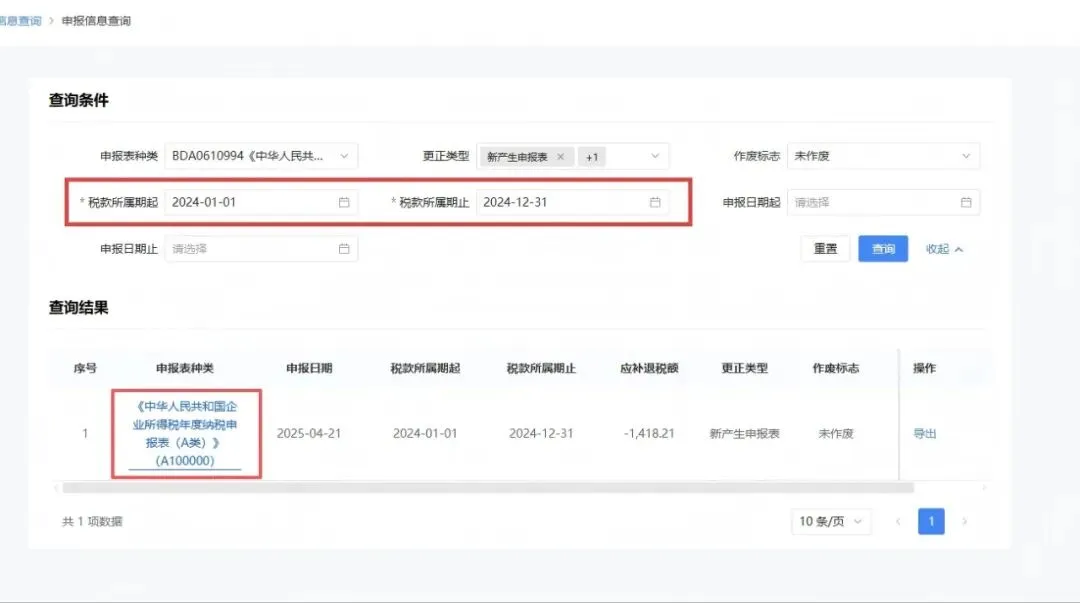 报表所属期选择需要查询的年度区间,选择完成后点击【查询】,直接点击蓝色字体【查询中华人民共和国企业所得税年度纳税申报表】。