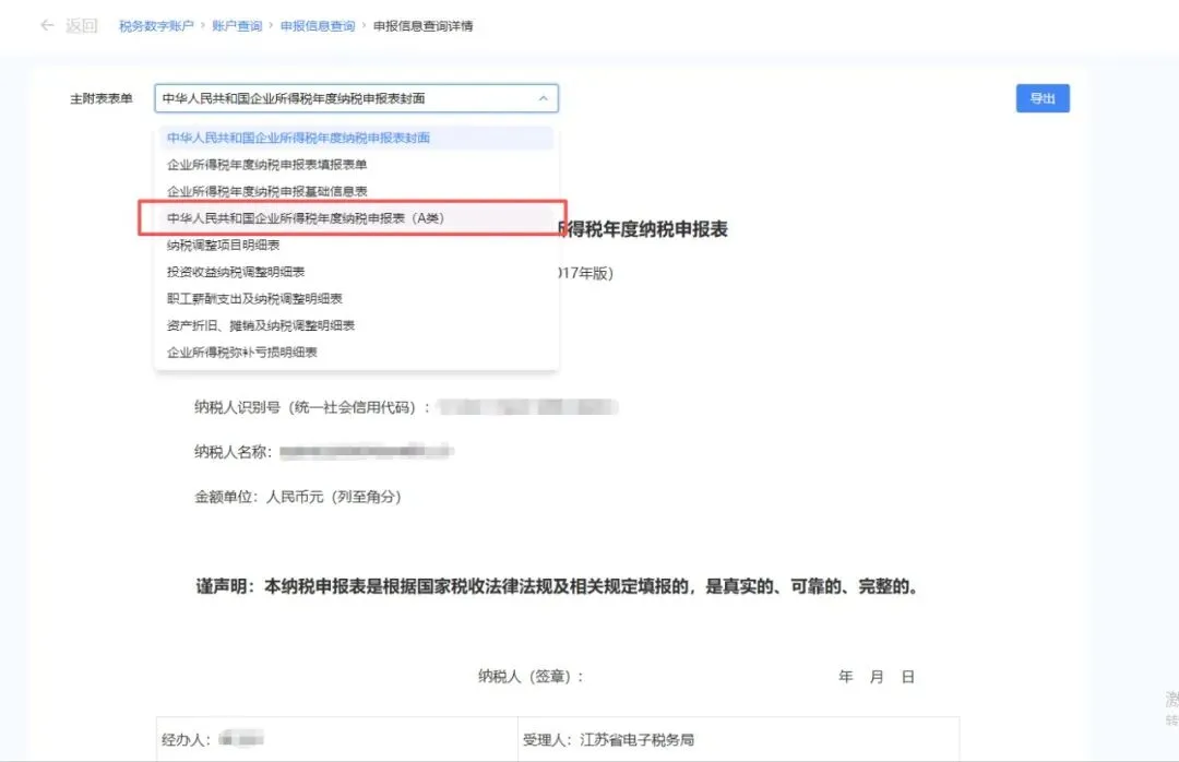 主附表表单选择《中华人民共和国企业所得税年度纳税申报表(A类)》,点击【导出】即可下载申报表主表。