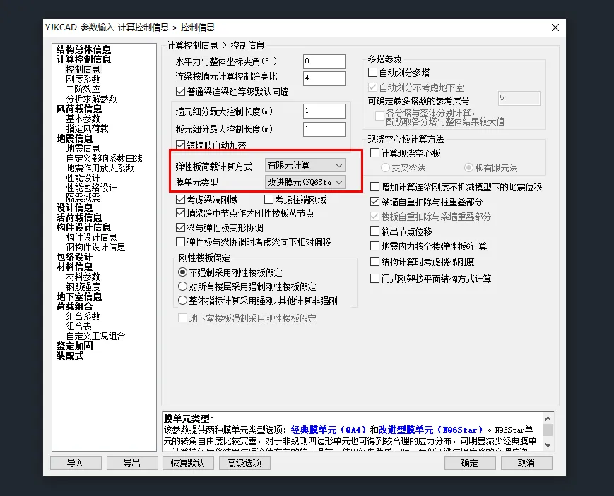 因此,凡涉及温度荷载的楼层,均应将楼板定义为弹性膜或弹性板6,不得采用软件默认的刚性板,也不得采用弹性板3。弹性板6考虑了楼板的面内刚度和面外刚度,适用于需要直接计算板配筋的情况;弹性膜的面外刚度为零,恒活荷载按平面导荷传递,对梁配筋影响较小,适用于以梁柱配筋为主的计算。