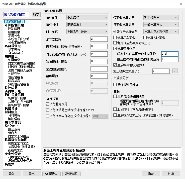 对于型钢混凝土构件和钢管混凝土柱,由于不属于钢筋混凝土构件,YJK软件保守处理,不考虑徐变应力松弛折减。若设计人员认为有必要折减,可参照《复杂高层建筑结构设计》取徐变应力松弛系数0.3~0.5,通过折减后的温差值输入温度荷载来实现。