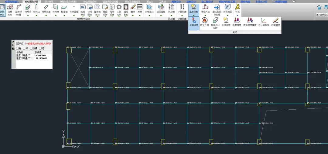 需注意以下几点:①地下室受周围土体包围,一般不受较大温差影响,不应对地下室定义温差荷载,否则将导致地下室内力配筋虚高;②正常做法是将升降温布置到地上一层及以上各层;③「节点温差」可使节点关联的梁、柱、墙及楼板构件均能考虑温度效应,而「构件温差」不支持楼板温差,故全楼整体升降温应优先使用节点温差方式。