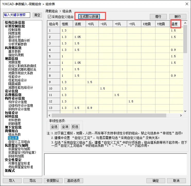 YJK采用有限元法计算温度效应,程序将节点温差转化为等效荷载,位移和内力的计算与其他荷载完全一致。「最高升温」和「最低降温」作为两个独立工况,与恒载、活载、风载、地震等作用一起参与组合。温度荷载的分项系数与竖向活荷载默认一致,设计人员可在设计参数的「荷载组合」分页中勾选「采用自定义组合及工况」按需调整。
