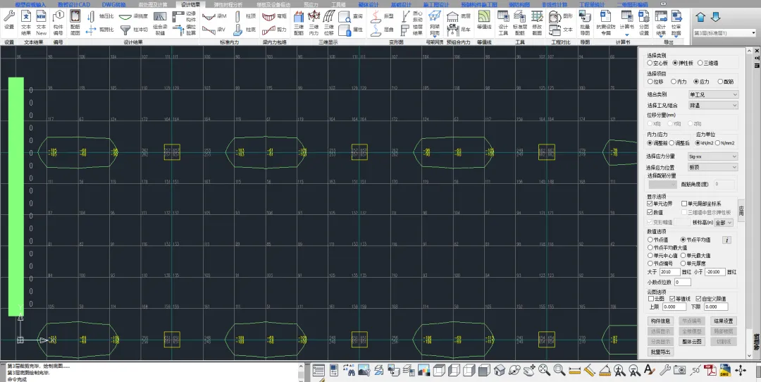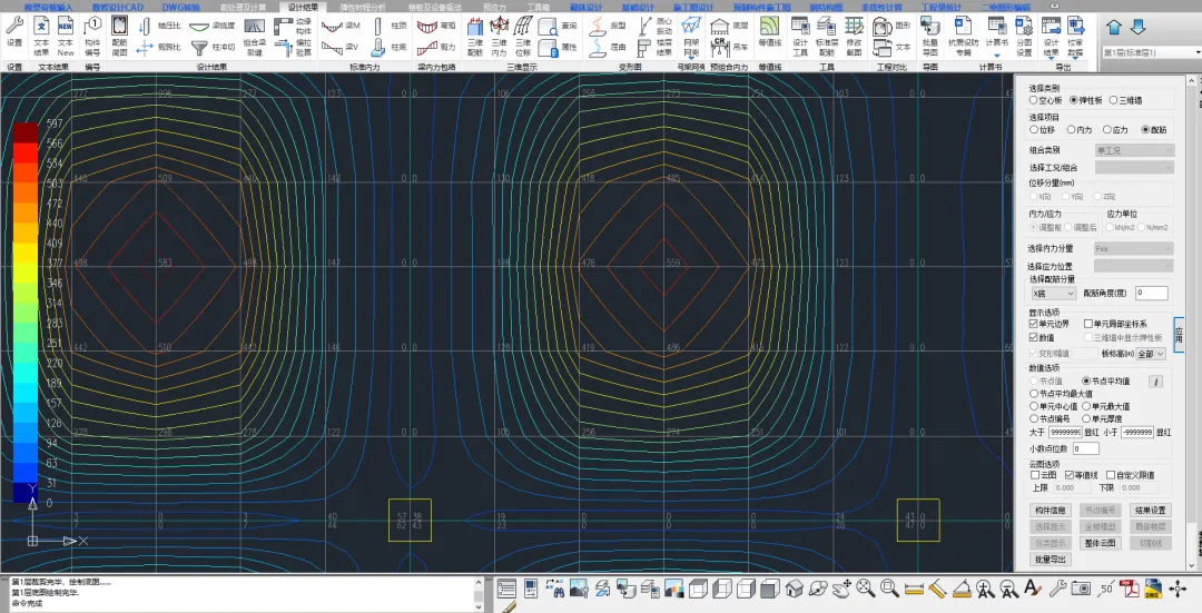 有限元方式—上部结构计算时,恒活面荷载直接作用。在弹性楼板上,不被导算到周边的梁墙上,板上的荷载是通过板的有限元计算才能导算到周边杆件。有限元方式既使弹性板参与了恒活竖向荷载计算,又参与了风、地震等水平荷载的计算,计算结果可以直接得出弹性板本身的配筋。在等值线菜单下可以查看弹性板的各种内力和配筋结果。