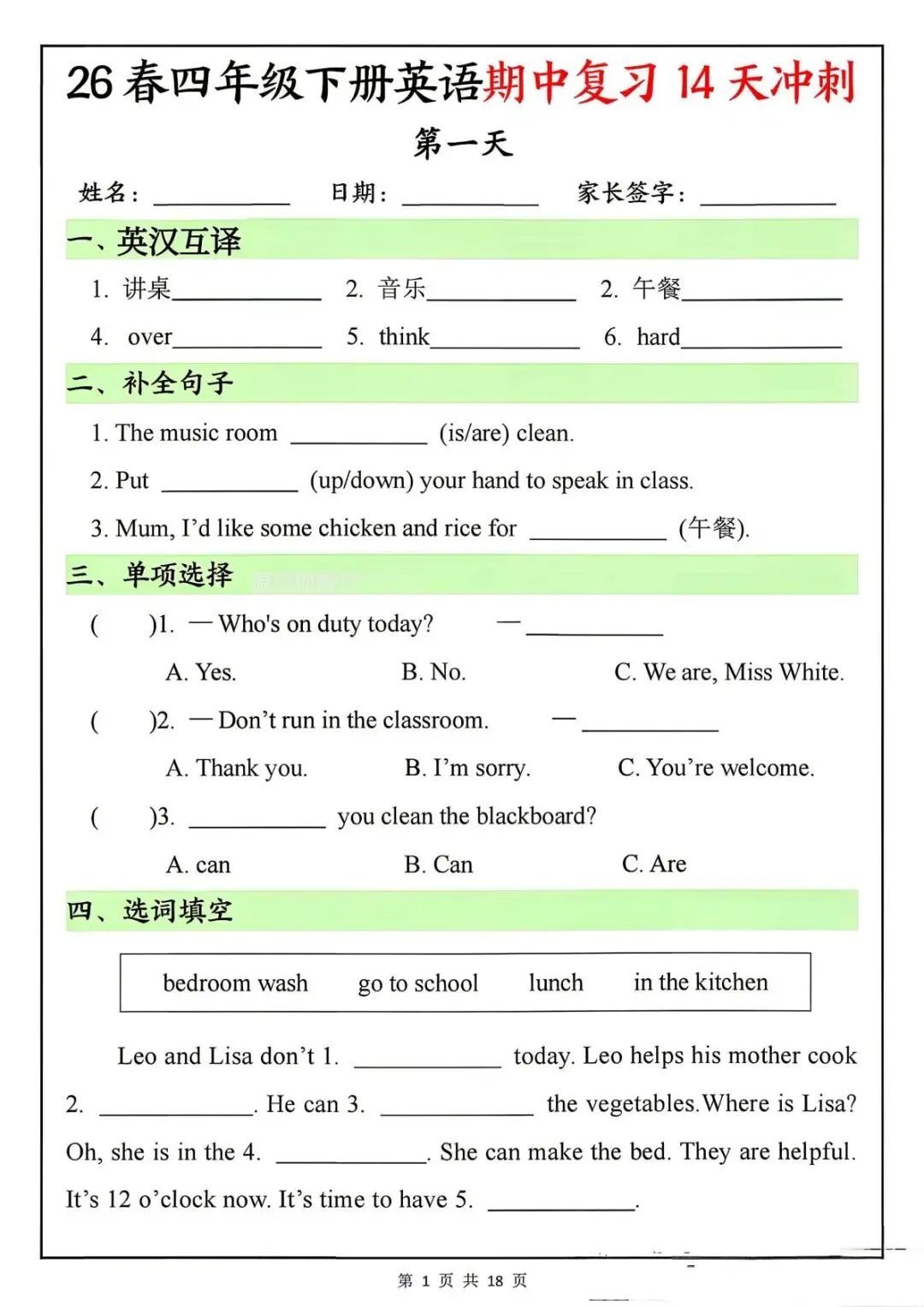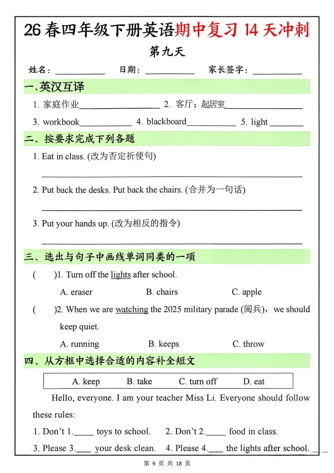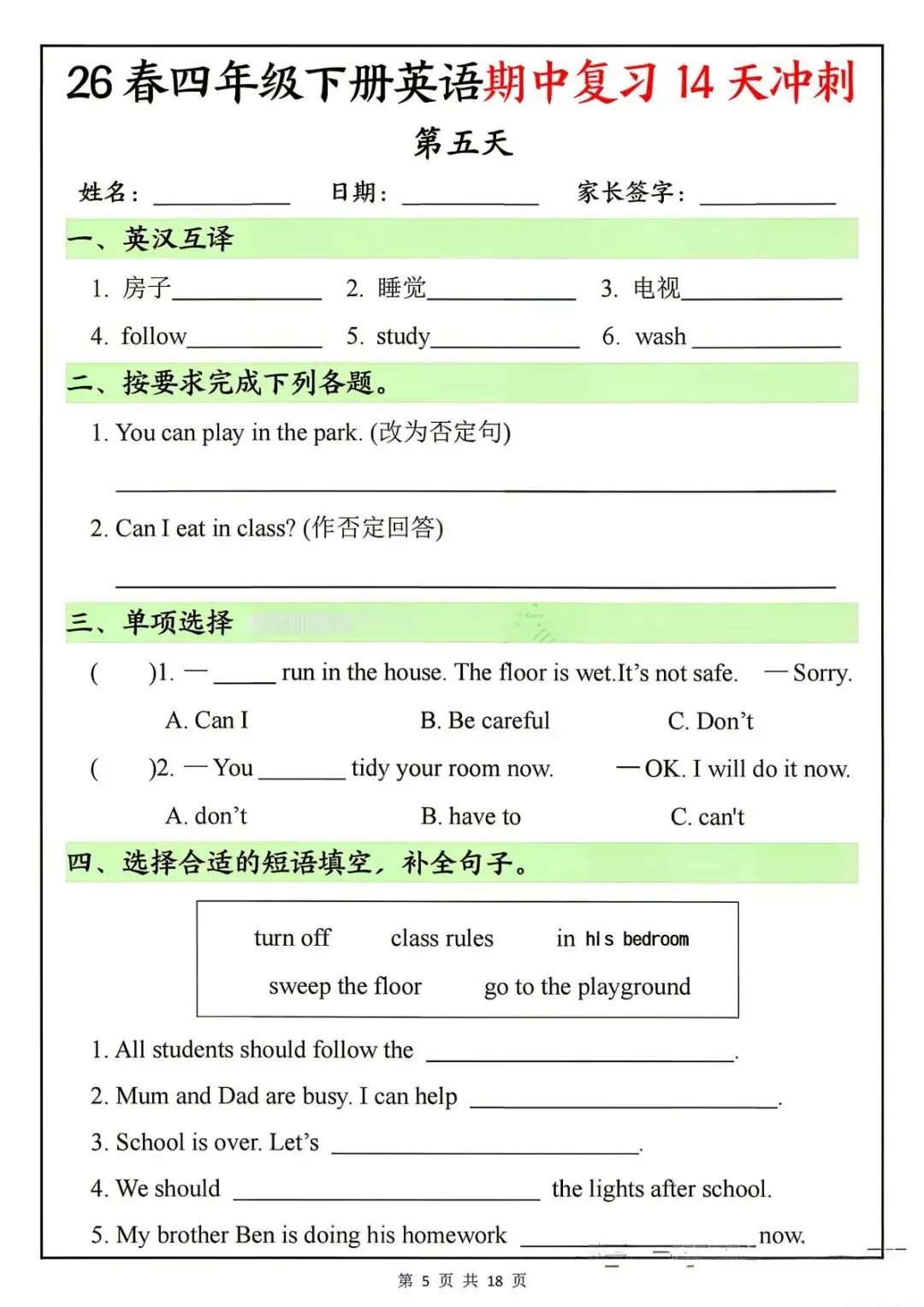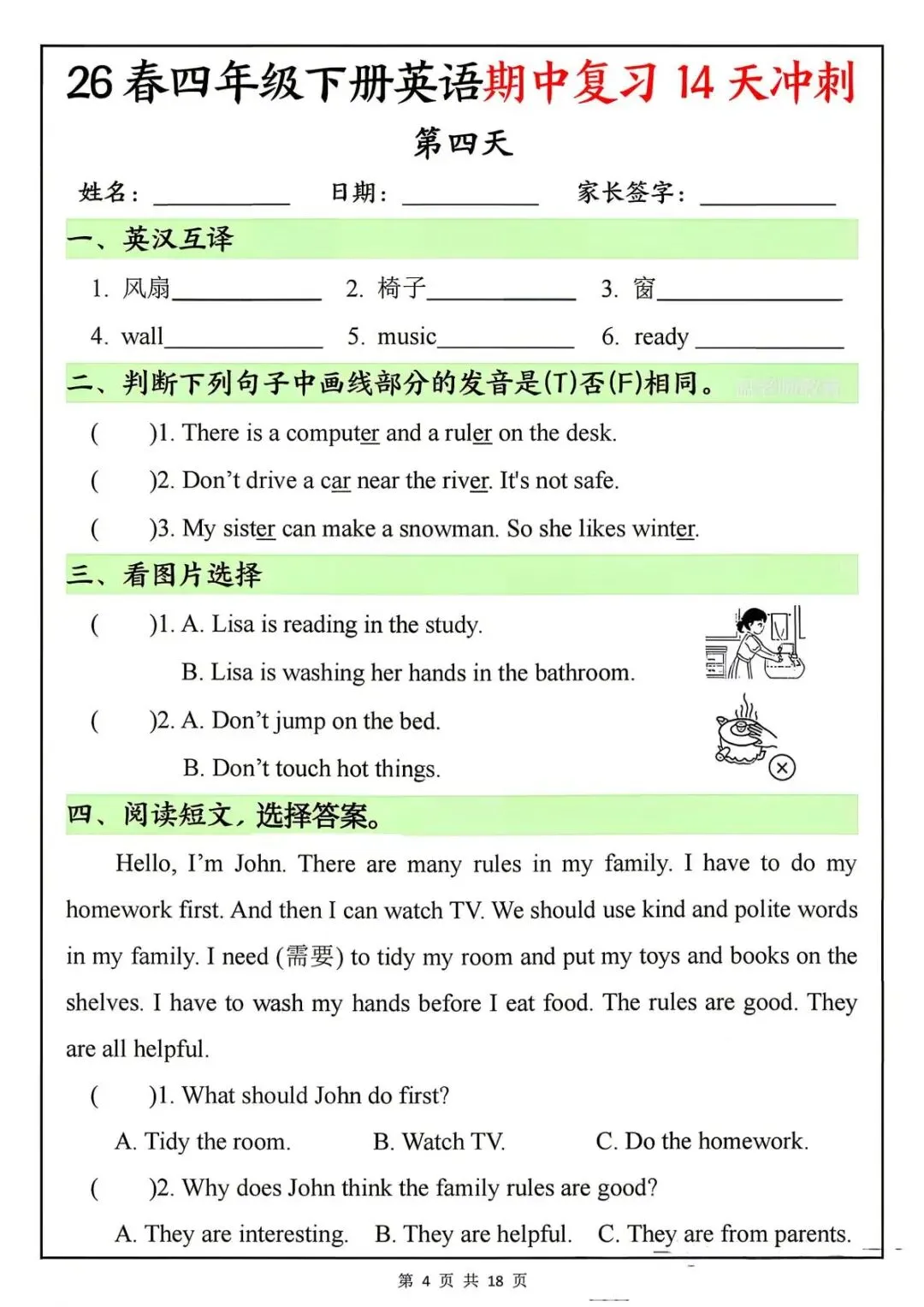 26春四年级下册英语期中复习14天冲刺-电子版可打印