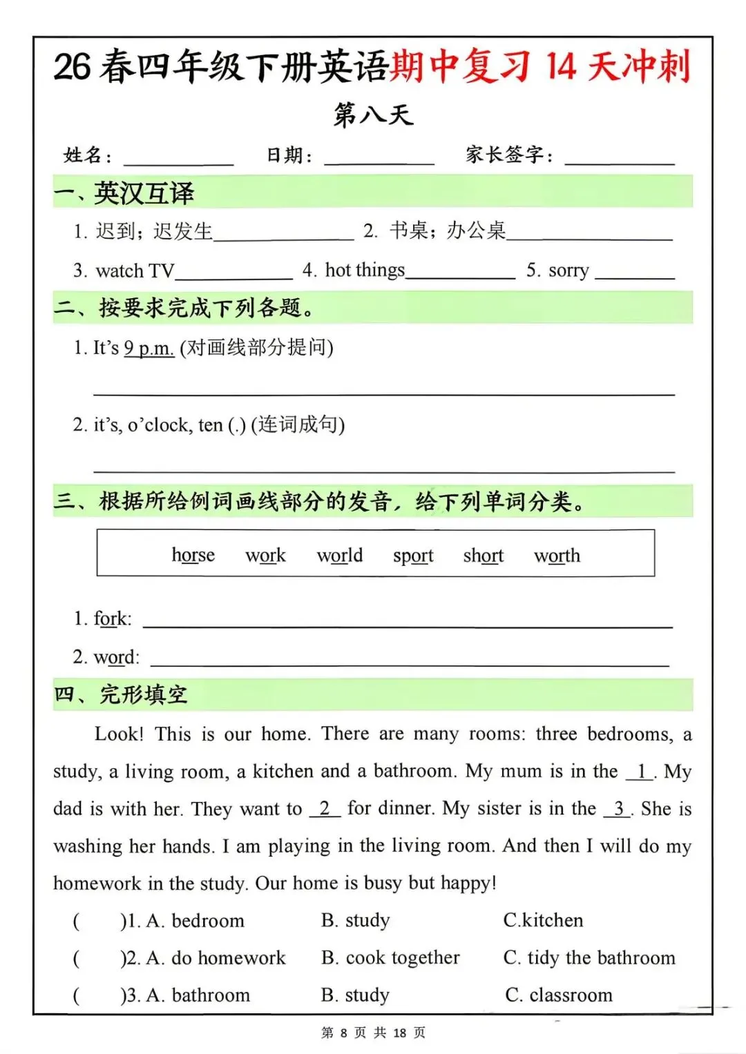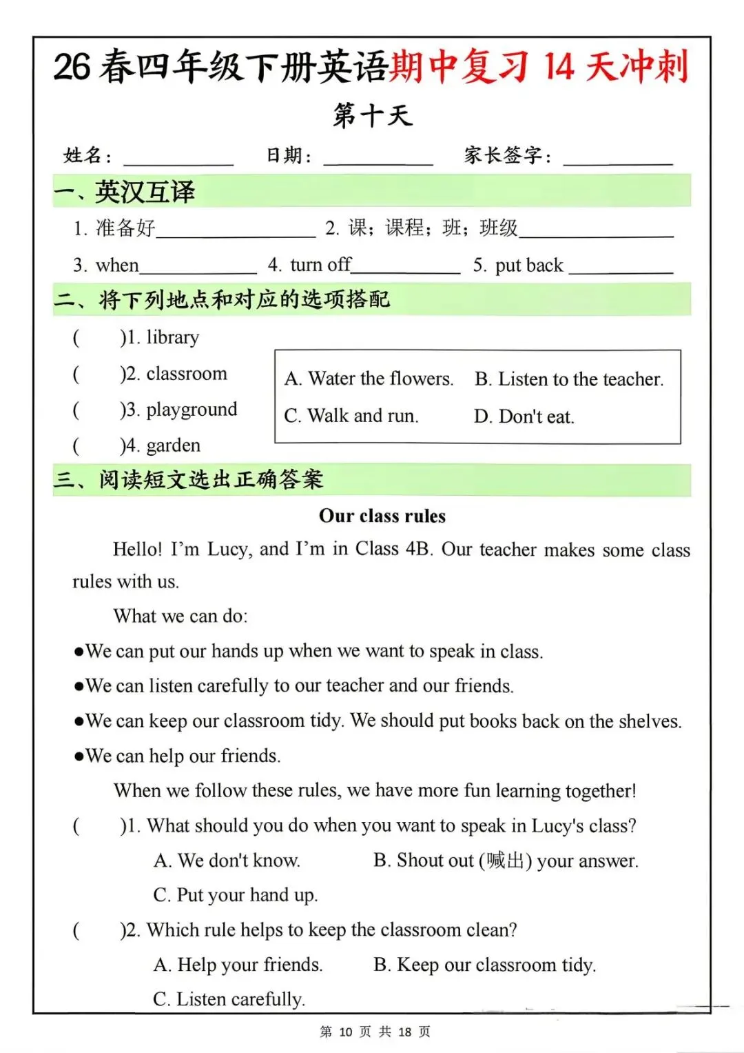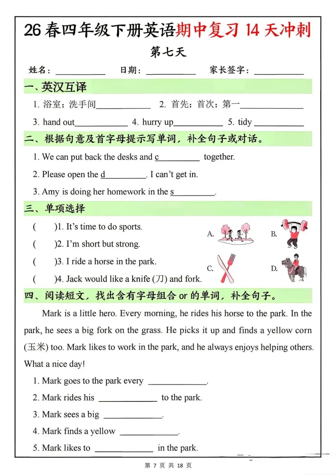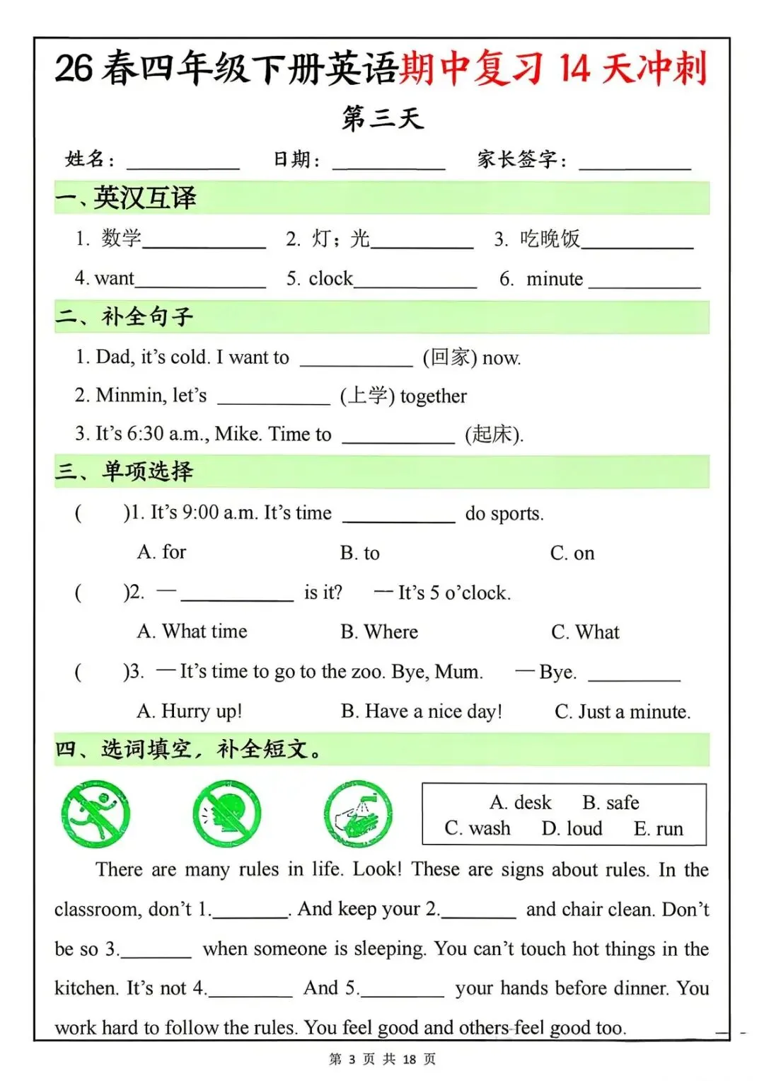 26春四年级下册英语期中复习14天冲刺-电子版可打印