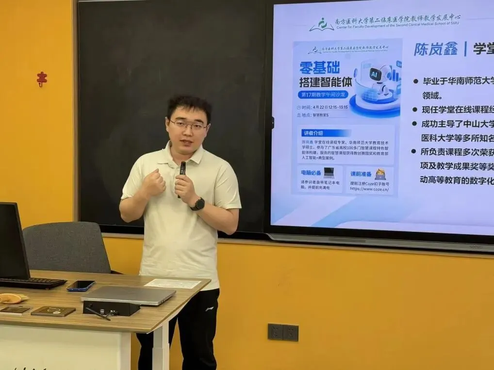 为适应信息化时代教育数字化转型的形势,切实提升我院临床教师运用AI技术赋能医学教育的能力,2026年4月22日中午,第二临床医学院教师教学发展中心成功举办第十七期教学午间沙龙活动。本期沙龙特邀清华大学学堂在线课程经理陈岚鑫老师担任主讲嘉宾,以“零基础搭建AI智能体”为主题,为我院临床教师带来了一场兼具理论深度、实操指导与行业前沿视野的干货分享。活动由教师教学发展中心、内科学教研室李晓丹主任主持,近40名临床教师齐聚一堂,共探AI与医学教学融合的新举措。