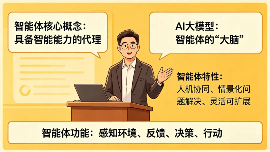 陈岚鑫老师首先阐释了智能体的核心概念。他将智能体比喻为“具备智能能力的代理”,能够实现人机协同、情景化问题解决,并具备灵活可扩展的特性。陈老师指出,AI大模型如同“大脑”,而智能体则是为其赋予具体技能的执行体,能够感知环境并做出反馈、决策与行动。