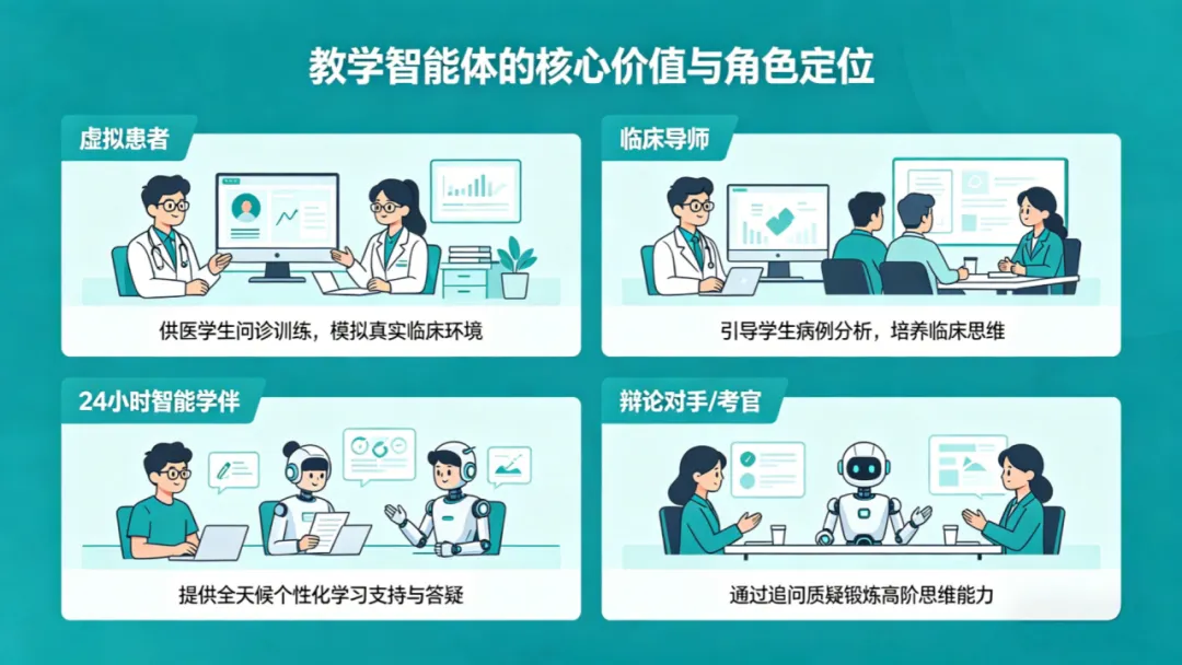 在阐述智能体概念的基础上,陈老师进一步分析了智能体在教学中的核心价值和应用场景。他指出,教学智能体可以扮演多种角色,服务于不同的教学场景:它可以模拟临床真实场景、扮演“虚拟患者”,供医学生进行无压力的沉浸式问诊训练;它可以扮演“临床导师”,引导学生进行病例分析,培养抽丝剥茧、严谨缜密的临床思维;它可以作为“24小时智能学伴”,为学生提供全天候的个性化学习支持与答疑服务;它还可以化身“辩论对手”或“考官”,通过追问和质疑锻炼学生的高阶思维能力。