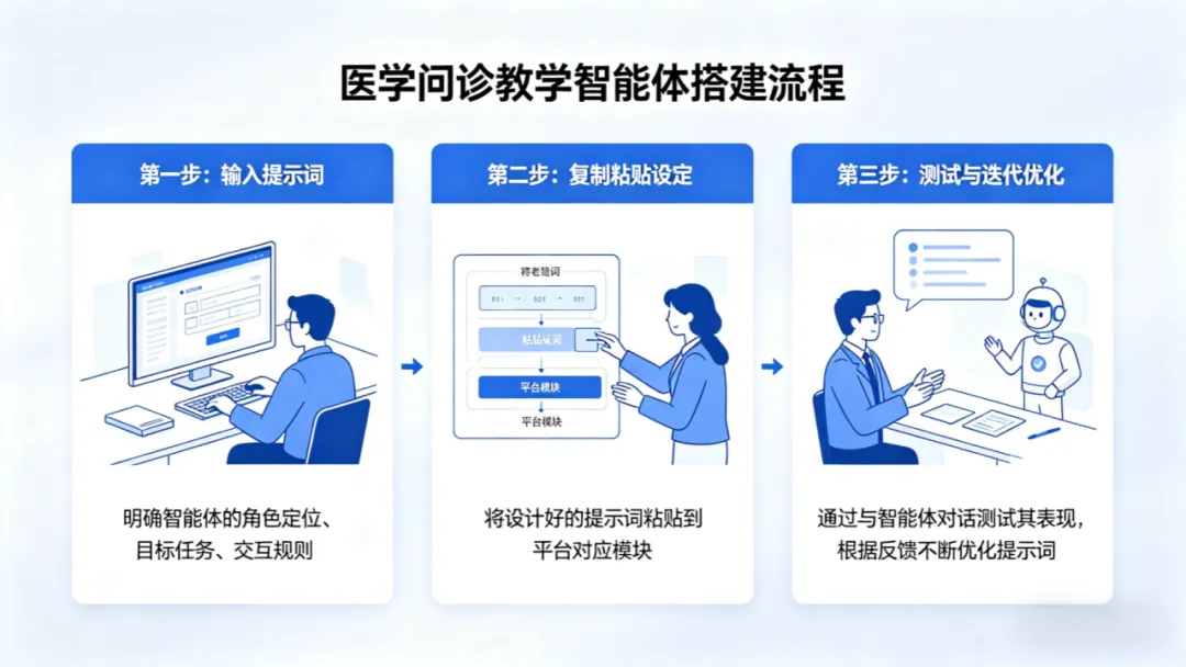 陈老师以“医学问诊教学智能体”为例,现场演示了搭建智能体的三个核心步骤:输入提示词(明确智能体的角色定位、目标任务、交互规则),复制粘贴设定(将设计好的提示词粘贴到信息化平台的对应模块),测试与迭代优化(通过与智能体对话测试其表现,根据反馈不断优化提示词)。