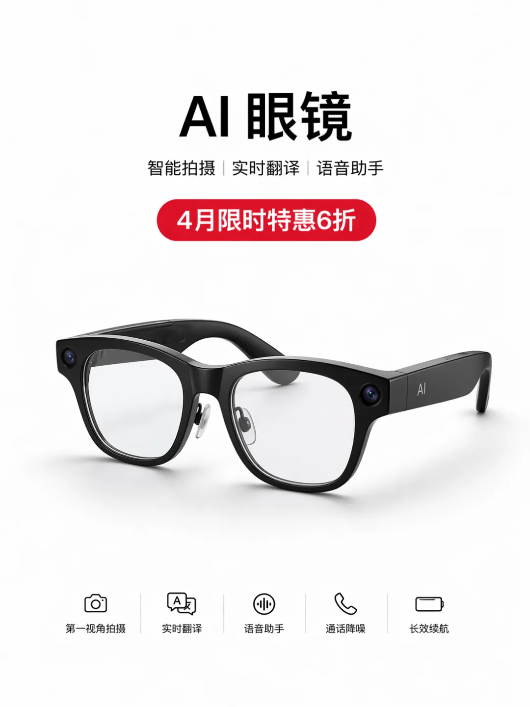 白色背景、AI眼镜产品居中、带有阴影,并标注“4月限时特惠6折” 。
