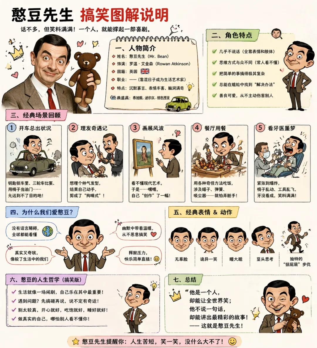 最后,我们让ChatGPT Images 2.0 来一张“憨豆先生搞笑图解说明”。