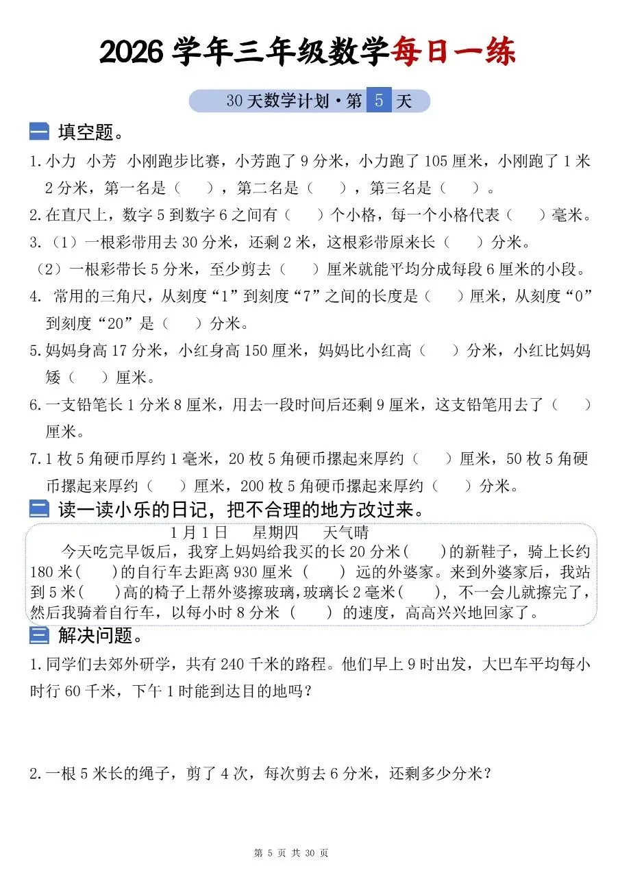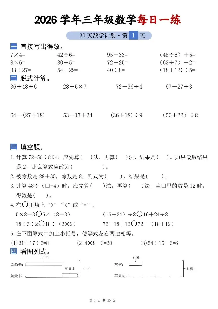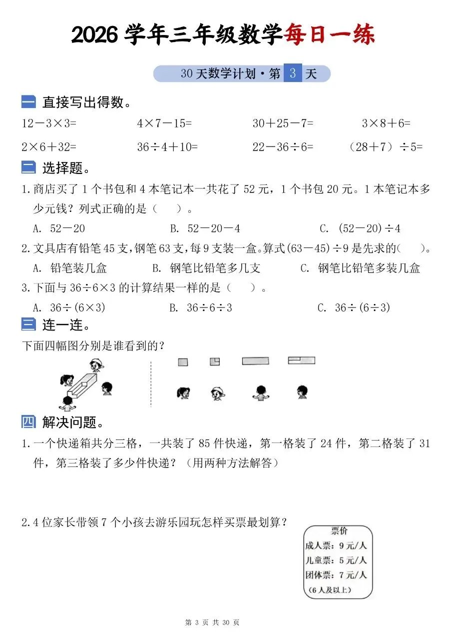 2026学年三年级数学每日一练电子版免费下载!