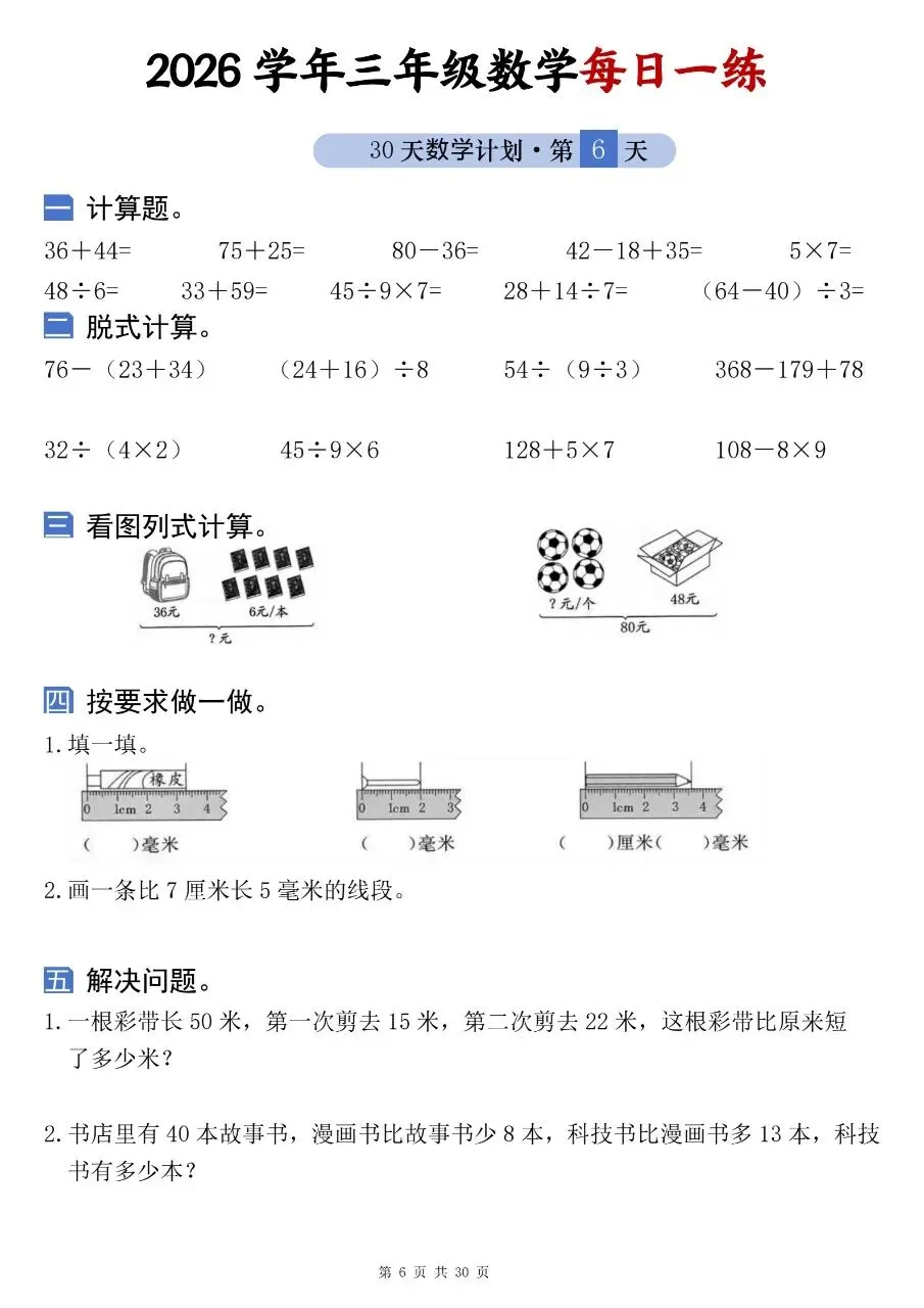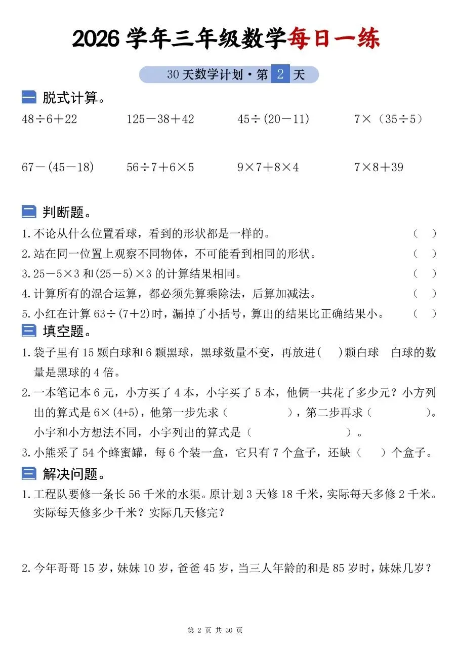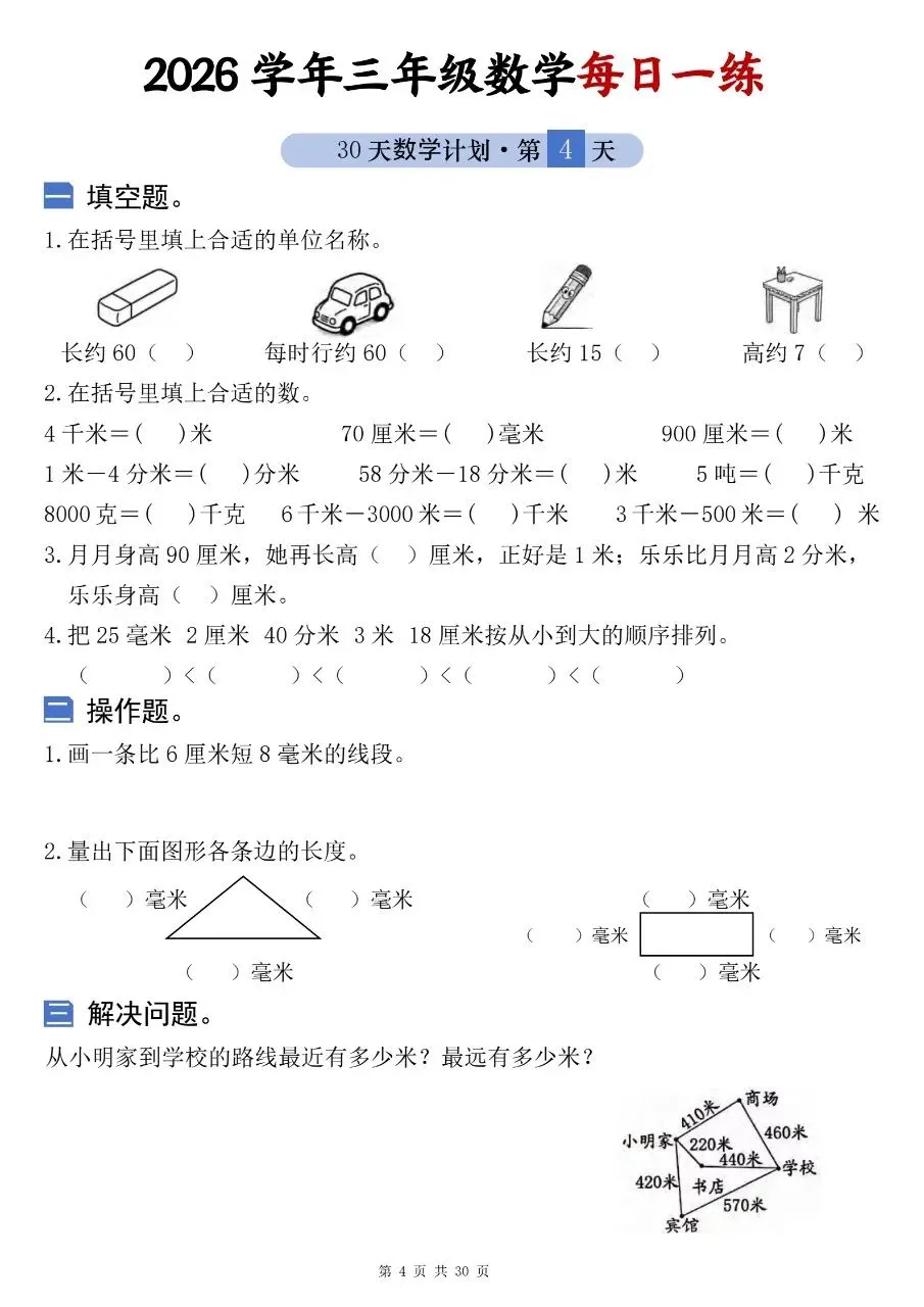 2026学年三年级数学每日一练电子版免费下载!