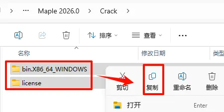 13.返回之前解压的“Maple 2026.0”文件夹,双击打开“Crack”文件夹,选中该文件夹下的全部文件,鼠标右键点击“复制”