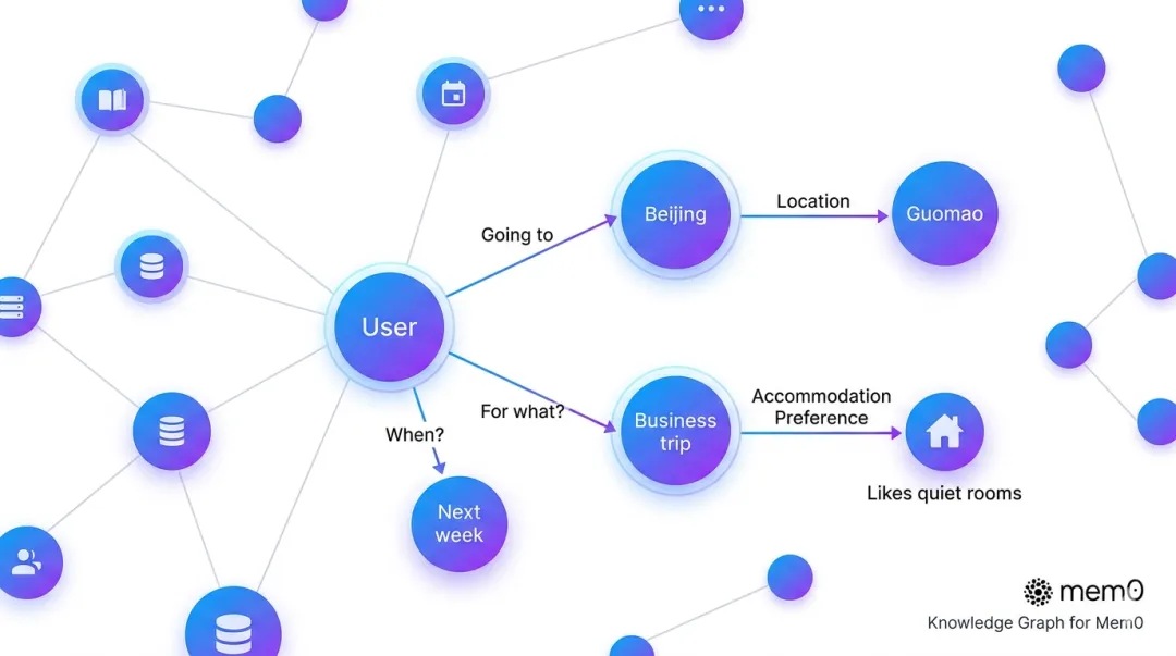 你说”我下周要去北京出差,住国贸附近”,Mem0会存下: