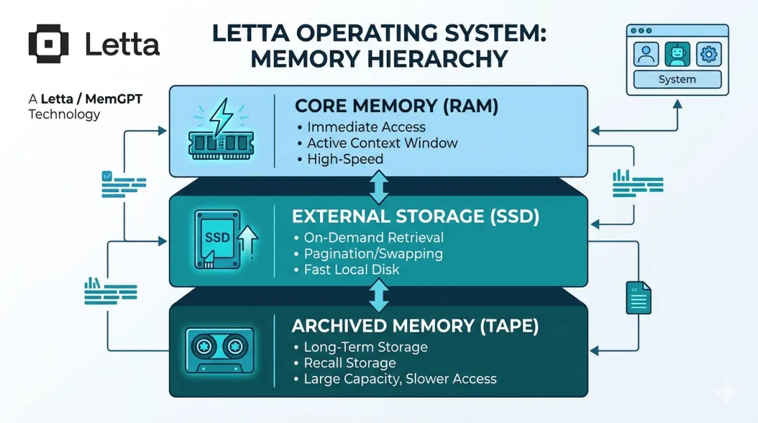 就像电脑有内存、硬盘、缓存的分层结构,Letta也给AI设计了类似的记忆层级: