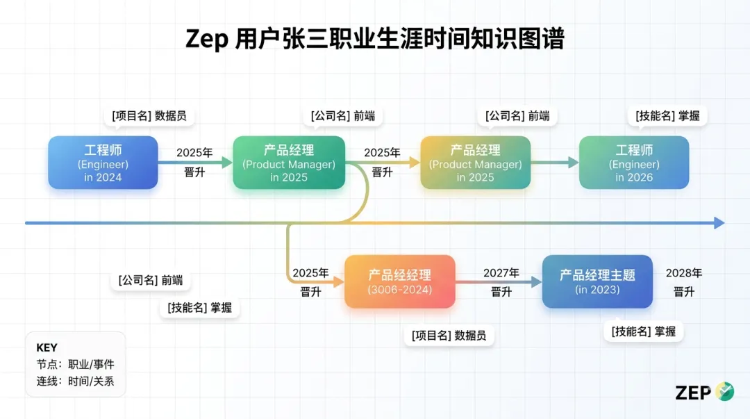 Zep能区分这两个状态。问”现在”张三的职业,答案是产品;问”去年”的项目,他还是工程师。