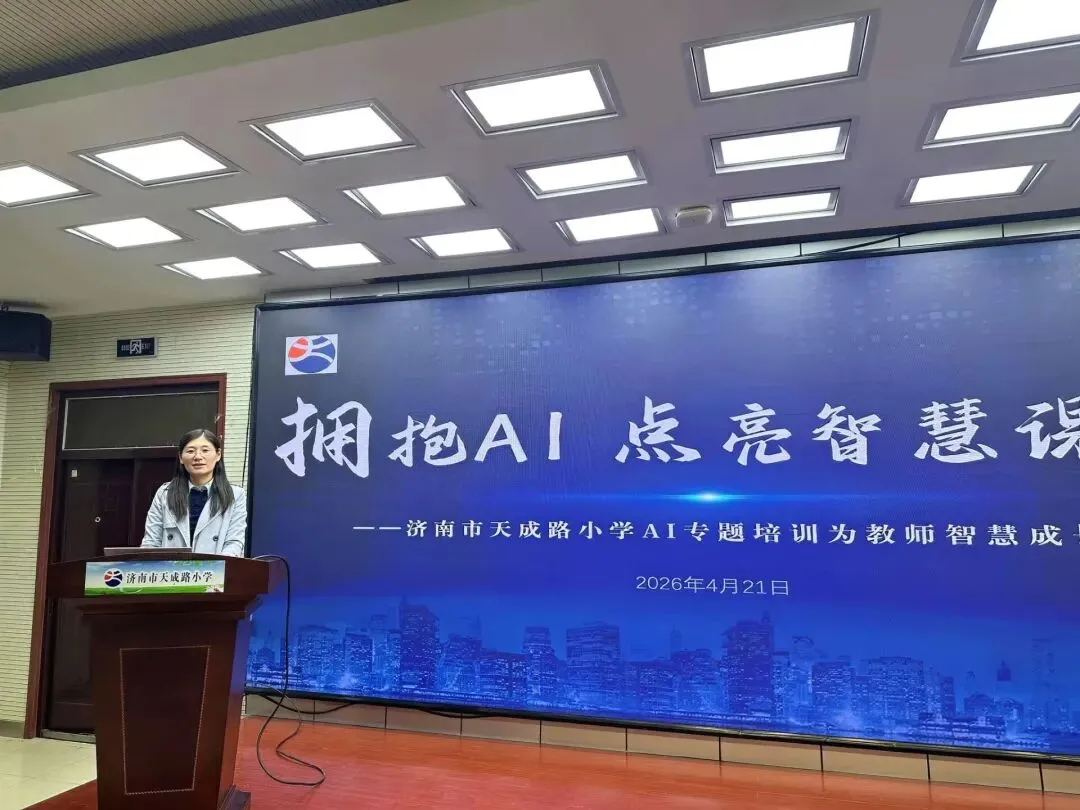 为积极响应国家教育数字化战略行动,推动人工智能技术与教育教学深度融合,提升教师数字素养,4月21日下午,济南市天成路小学特邀山东师范大学学术交流中心外聘专家宋博扬老师,为全体教师带来一场题为“人工智能工具教学应用”的专题培训。本次活动也是学校落实2026年天桥区教育教学信息化交流展示活动的重要动员与实操演练。