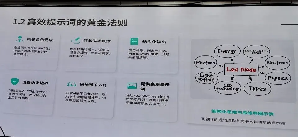 针对教师们普遍遇到的“指令无效、输出不准”等难题,宋老师手把手指导教师掌握结构化提示词设计与优化技巧——从“明确角色受众”“任务描述具体”“结构化输出”“设置约束边界”到“思维链”“提供高质量示例”,六大黄金法则让教师们豁然开朗。她还现场演示了如何利用豆包搭建“24小时在线数字助教”,将课件、讲义上传后,学生随时提问,AI基于教师自己的教学材料给出标准答案,真正实现“人人为我师,我为人人师”。