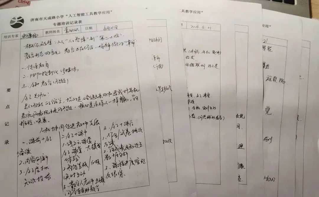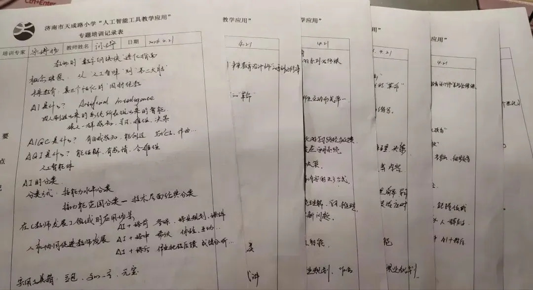 整场培训中,全体教师认真聆听、详细记录——有的记下了实用的提示词模板,有的画出了AI工具矩阵图,还有的写下了自己准备参赛的作品创意。
