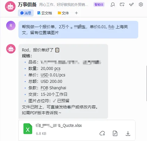 写给飞书(#openclaw)一句话,让自己满意的报价单就完成了 🔥 报价单 Skill 上线了 让claude做出个skill,用自己喜欢的模板投喂 以前做一份正式报价单:找模板 → 改格式 → 核数据 → 调排版,10分钟起步。 现在跟 OpenClaw 说一句话,客户名、产品、数量、价格丢进去,公司抬头、银行信息、条款全部自动填好,Excel + PDF 同步输出,格式专业、数字准确,直接发客户。 省的不只是时间,是报价这件事的心理负担。 #OpenClaw #外贸效率 #Claude