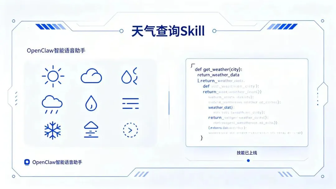 # 手动安装(复制到 skills 目录)cp -r weather-skill ~/.openclaw/skills/weather# 或使用 openclaw CLI 安装本地 Skillopenclaw skill install ./weather-skill# 验证安装openclaw skill list