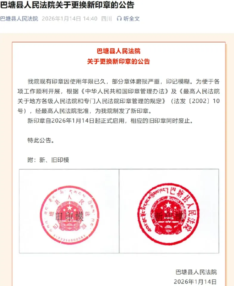 于是他们在微信公众号上发布了一则公告,“根据《中华人民共和国印章管理办法》及《最高人民法院关于地方各级人民法院和专门人民法院印章管理的规定》,经最高人民法院批准,为我院制发了新印章。”