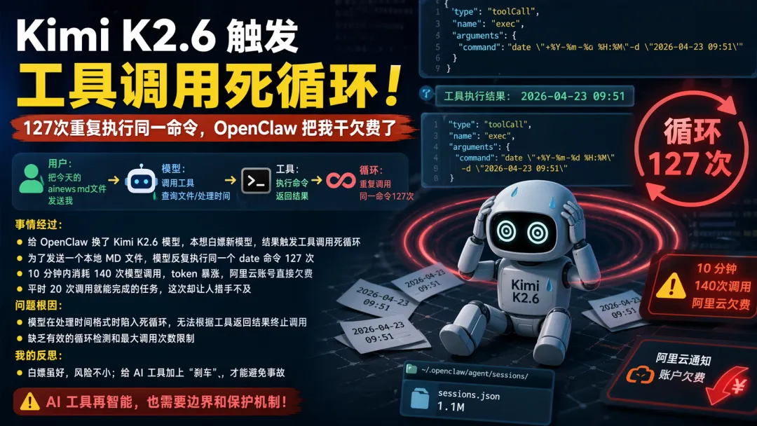 说结论:我给OpenClaw换了个叫kimi-k2.6的模型,这家伙钻死胡同了——同一个工具咔咔调了120多回,直接把我那个本来就紧巴的阿里云账号给干欠费了!你说这事儿整的!