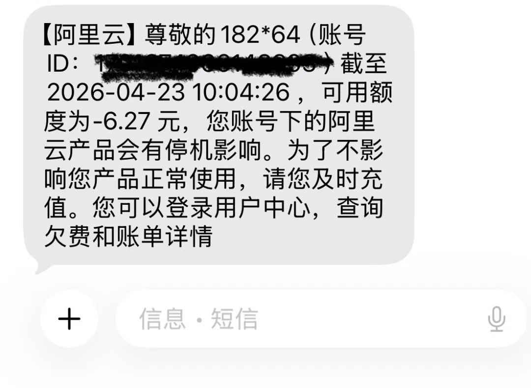 结果今天等来的不是文件——是阿里云欠费短信!你说我这账号本来就穷得叮当响,这下直接给我干穿底了!