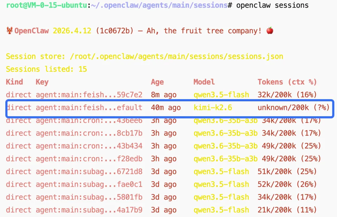先瞅了瞅session信息。token那一列,200k是上限,前面那个数是当前实际用的。kimi这条明显不对劲——总token数都没算出来!你说这玩意儿靠谱吗?