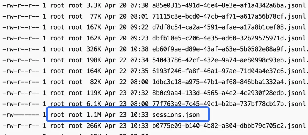 又跑到 agent/sessions 目录底下,找到那个时间点的session文件。好家伙,比别的文件大出一大截!跟我的肚子似的,一看就没少装东西。