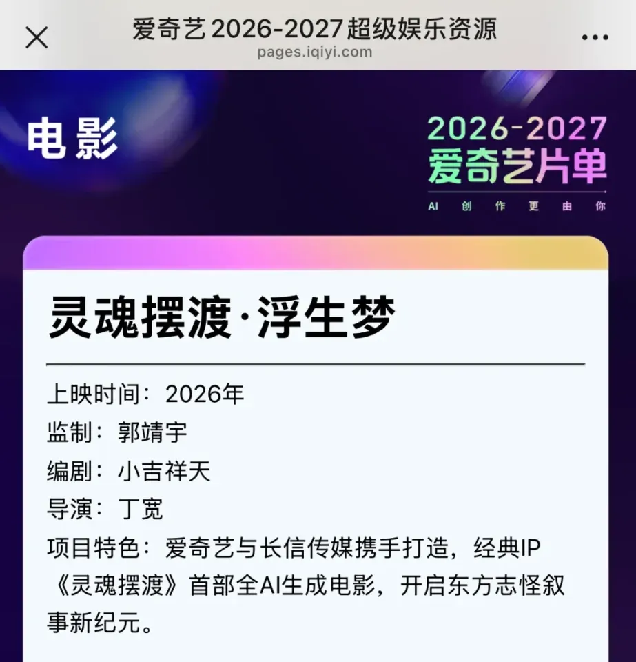 4月22日,《灵魂摆渡·浮生梦》官宣全AI生成,定档暑期档。