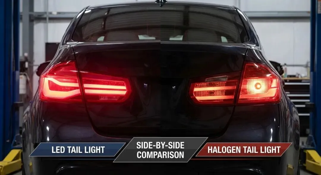 LED vs 卤素的对比图,左右分屏+清晰标注,产品优势直接摆在客户脸上。而且光影一致、风格统一,不会出现左边像是白天、右边像晚上的尴尬。