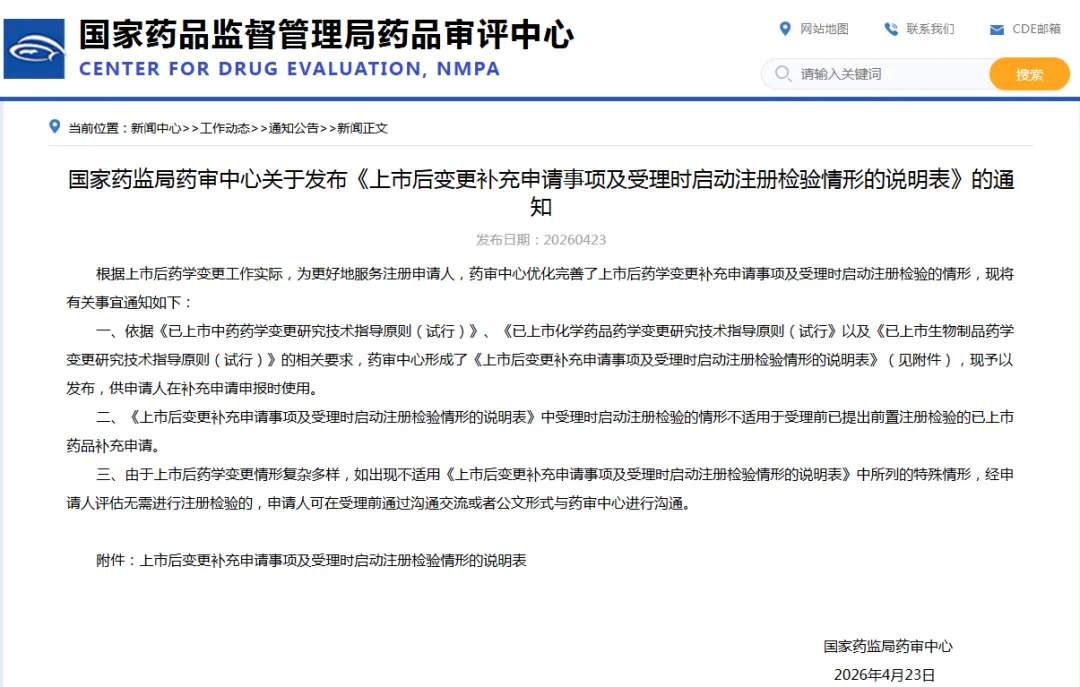 2026年04月23日,CDE发布了《上市后变更补充申请事项及受理时启动注册检验情形的说明表》的通知,明确了中药、化药和生物制品哪些变更是否要开检验通知书,具体内容如下: