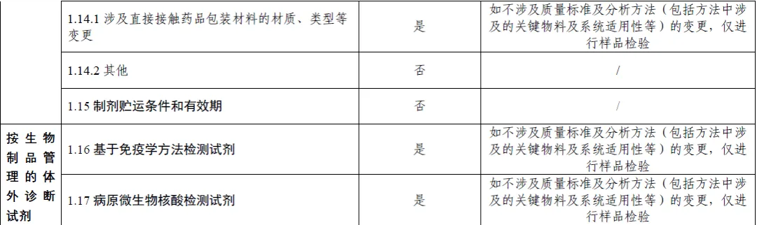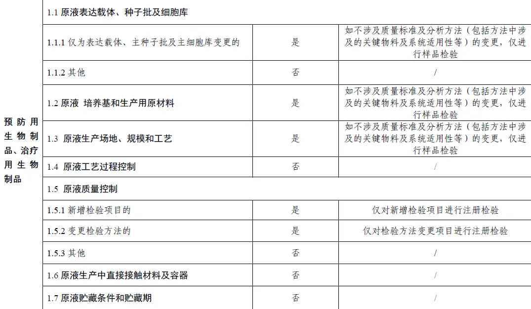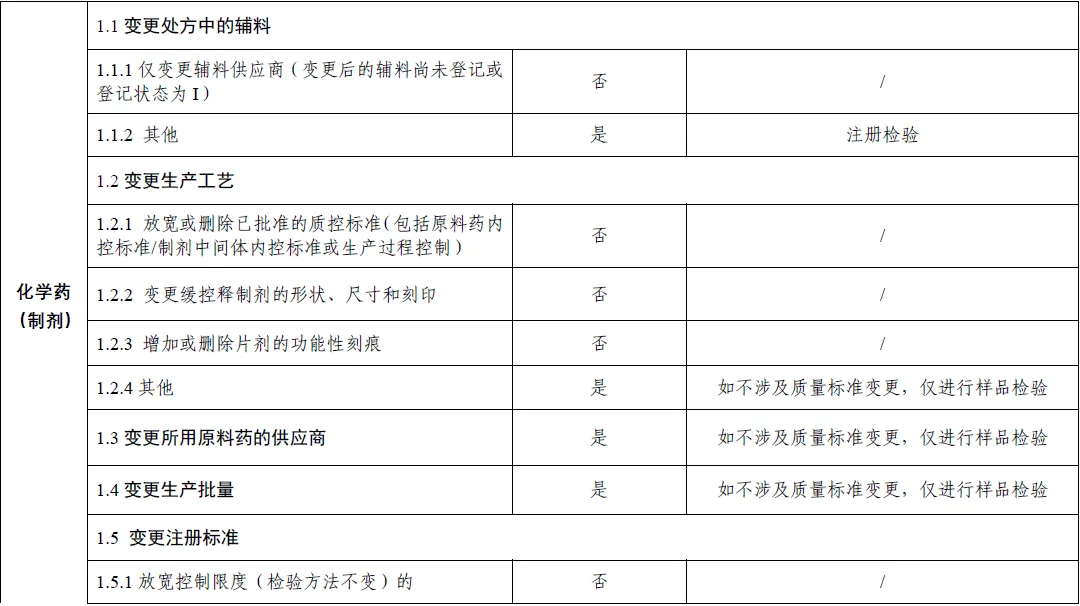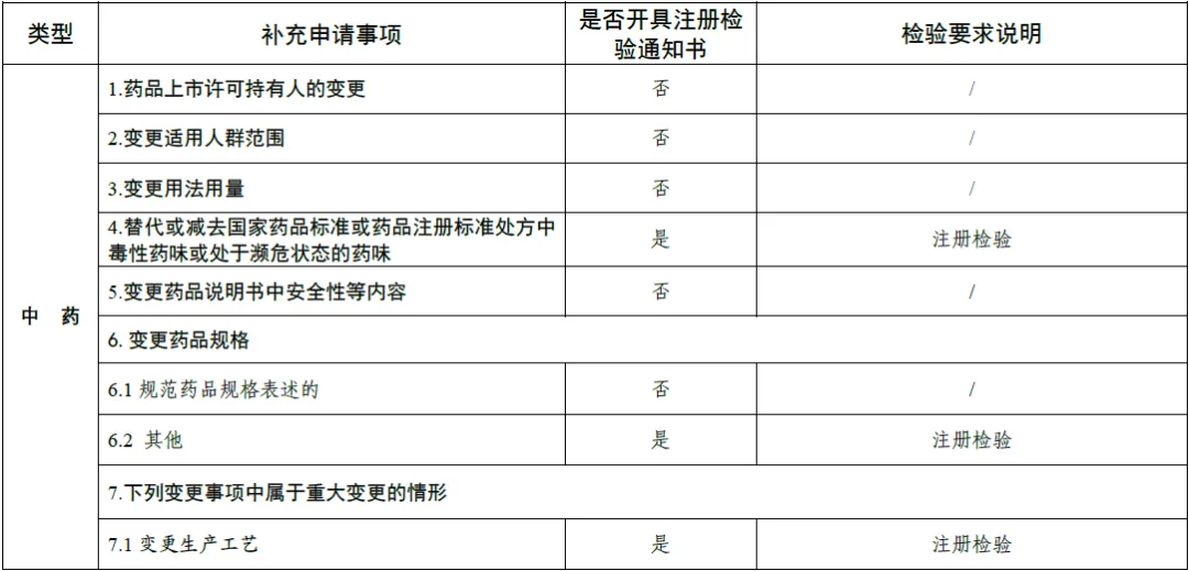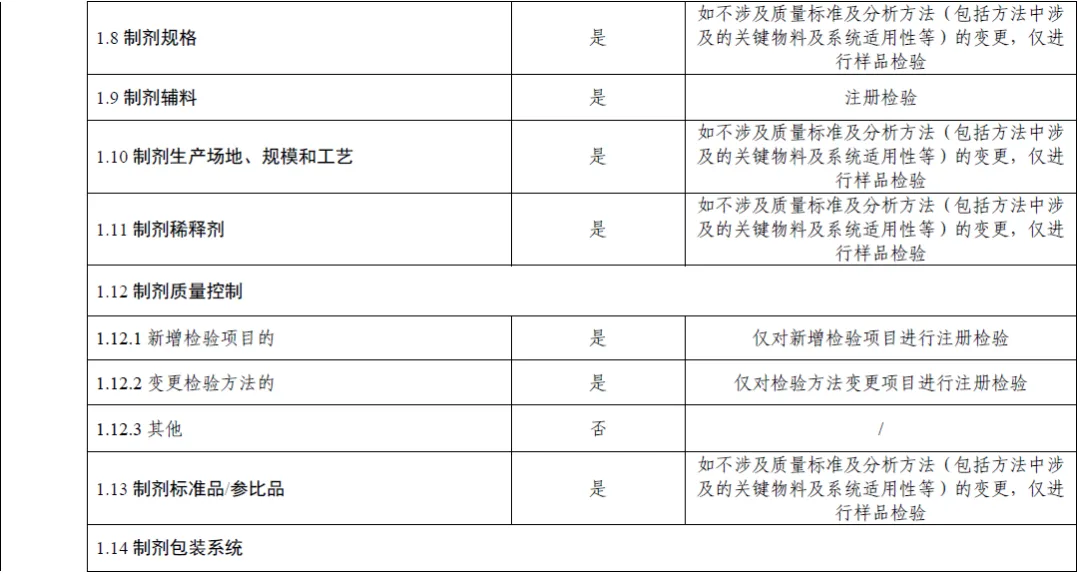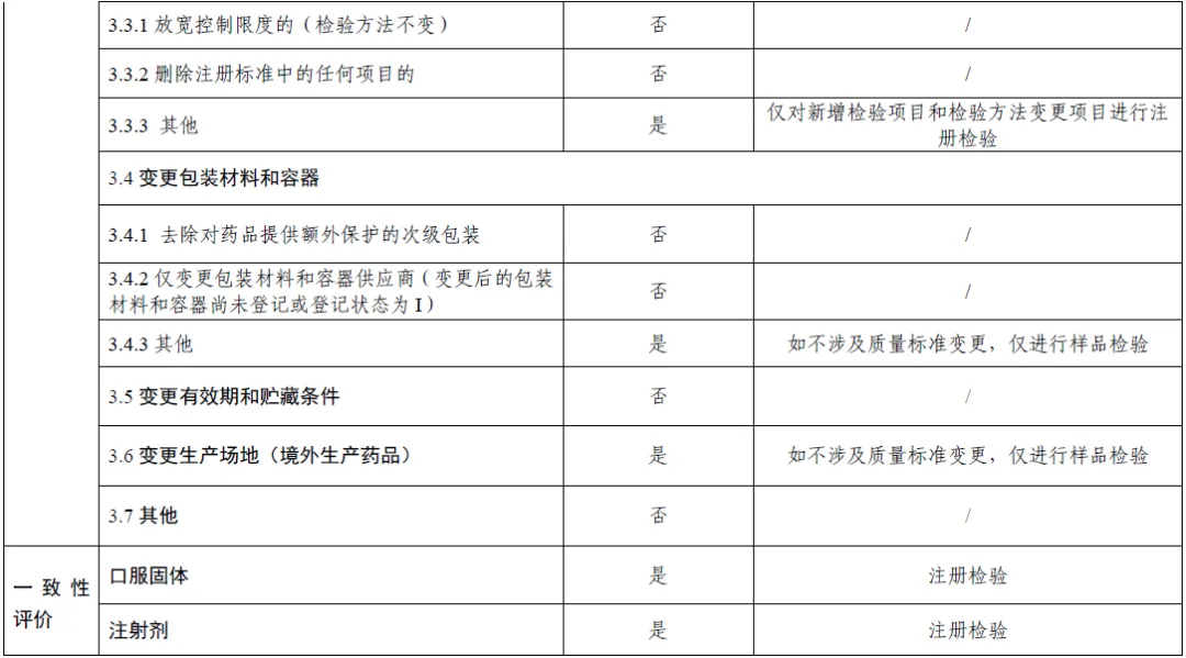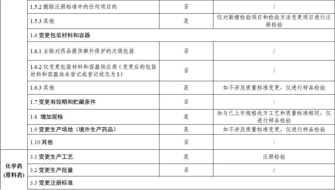 2、说明表中内容为原则上是否需启动注册检验的情形。由于上市后药学变更情形复杂多样,如受理时未启动注册检验,技术审评中会结合变更内容对产品质量的影响,必要时也会启动注册检验。