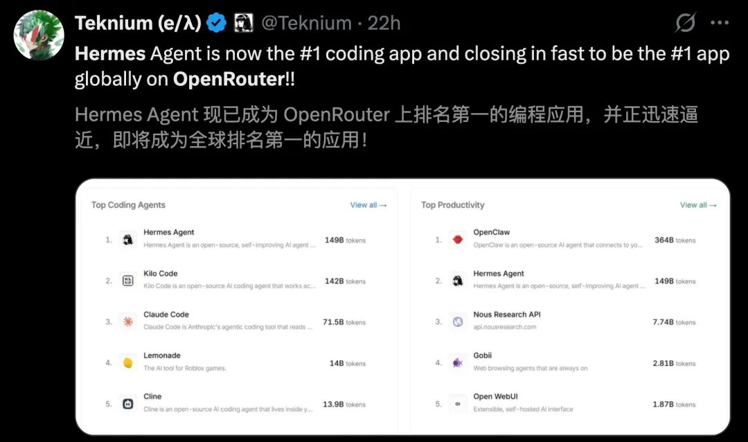 就在今天,Hermes在OpenRouter上的token消耗日榜位列第二,仅次于OpenClaw。