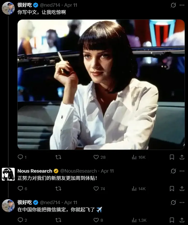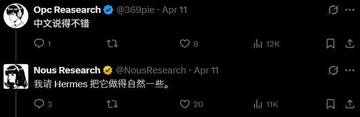 至于中文写得为什么这么顺,Nous自己揭了底,他们请Hermes帮忙润色过。