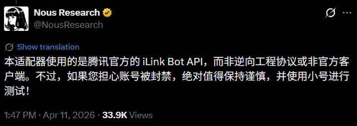 技术底色这边Nous也交代了一句,用的是腾讯官方的iLink Bot API,不是第三方破解协议或非官方客户端。