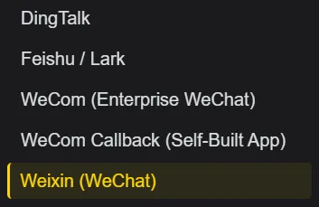 钉钉、飞书、企业微信、企业微信自建应用回调,加上这次新加的个人微信,一个不落。