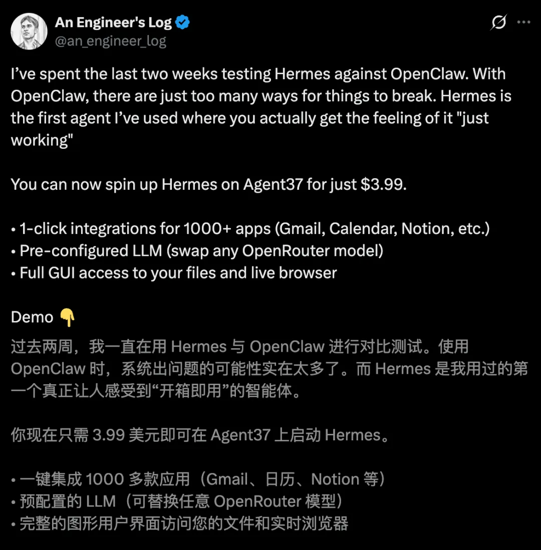 Hermes才是真正让他感受到「开箱即用」的AI Agent,而且仅需3.99美元即可用上了。