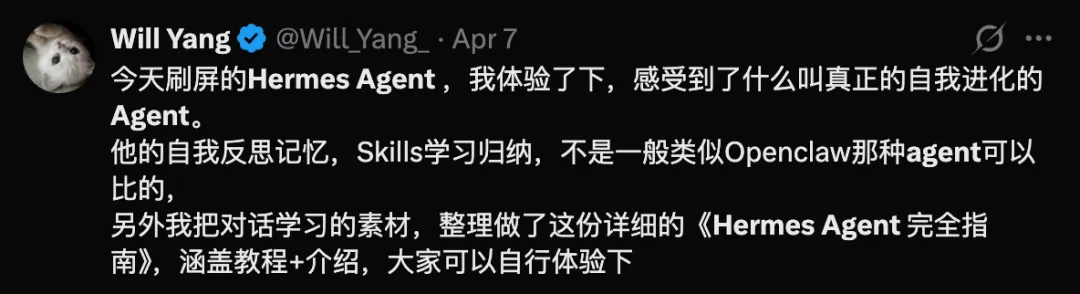 还有国内大佬体验后,一致认为Hermes Agent把真正的「自我进化」体现的淋漓尽致。